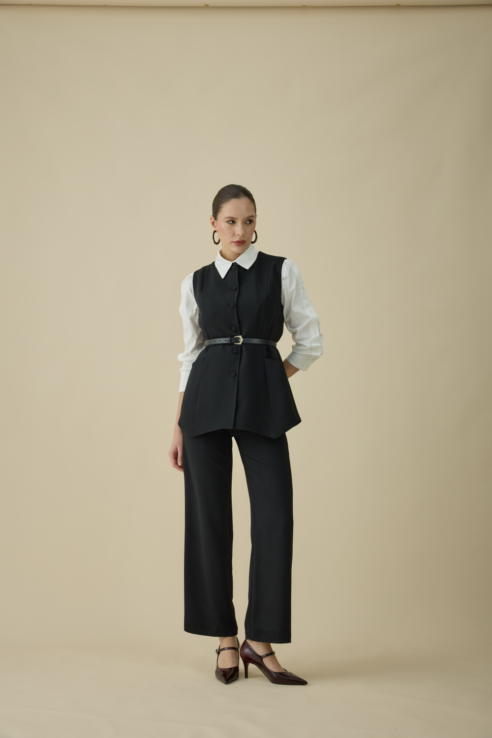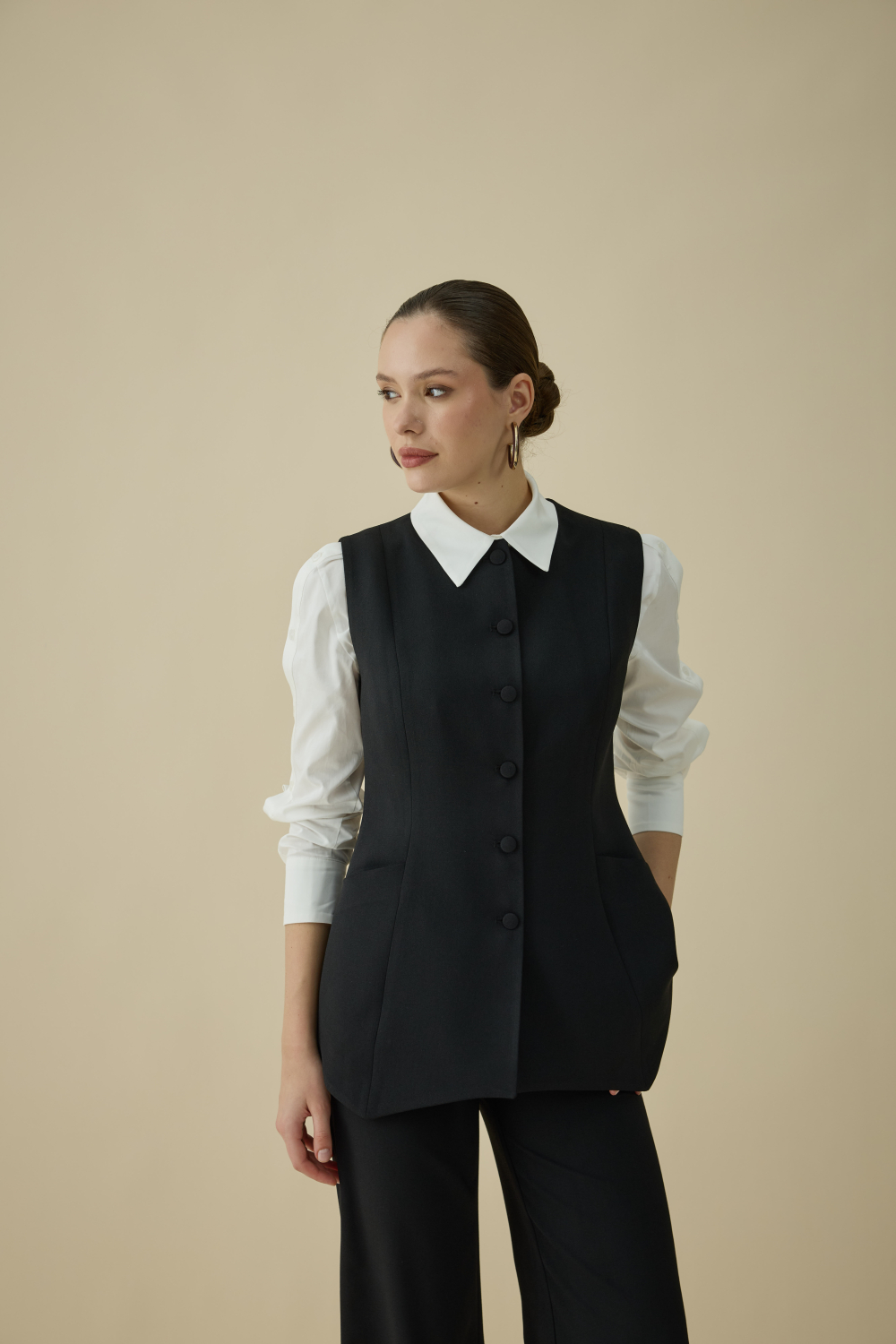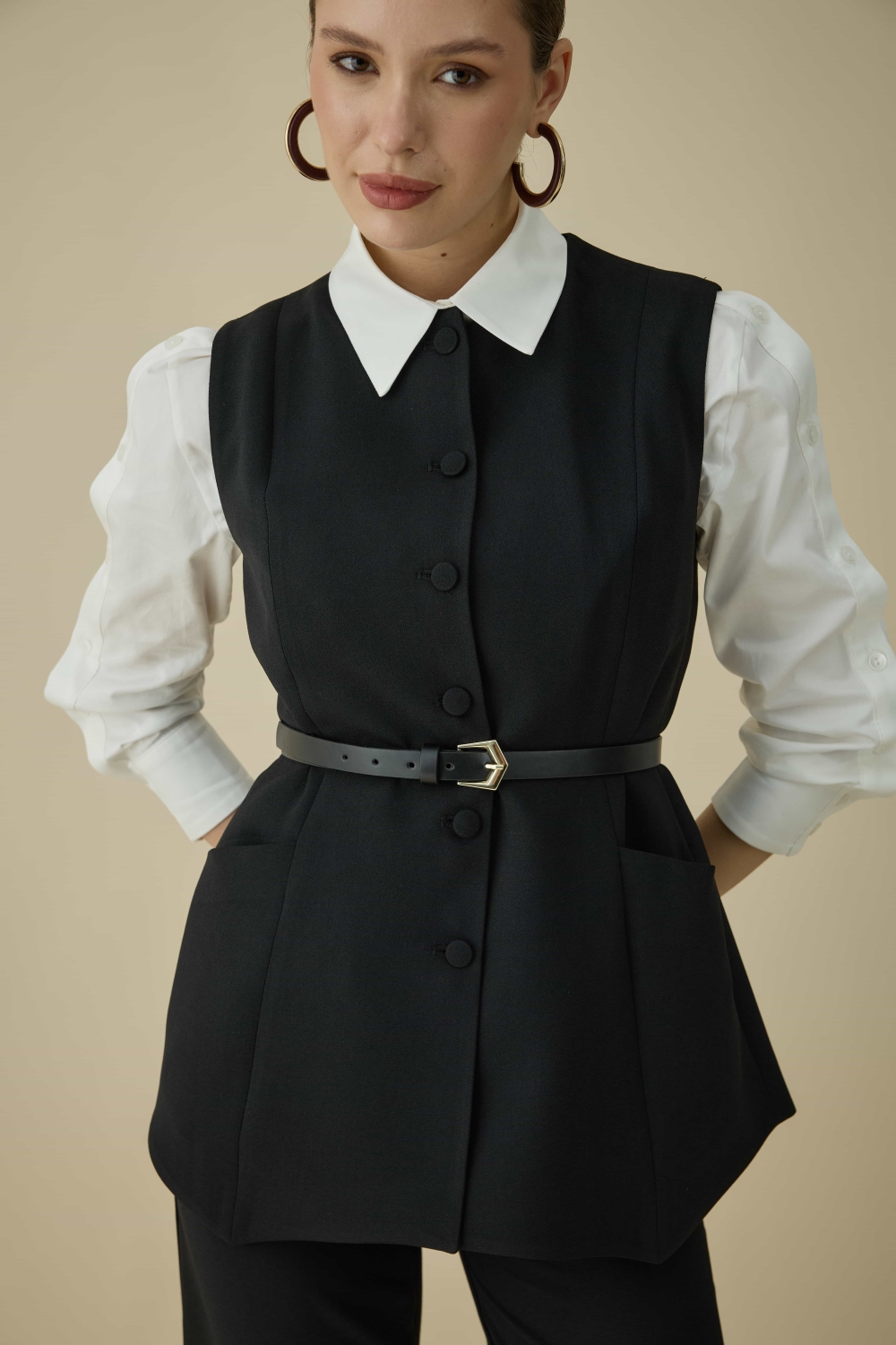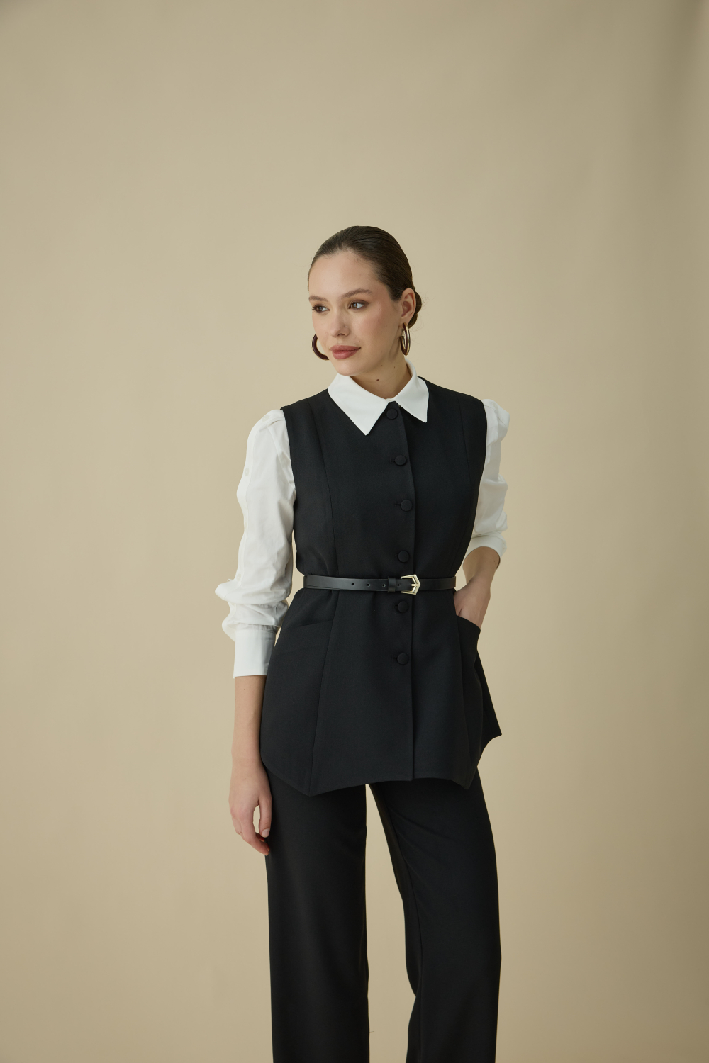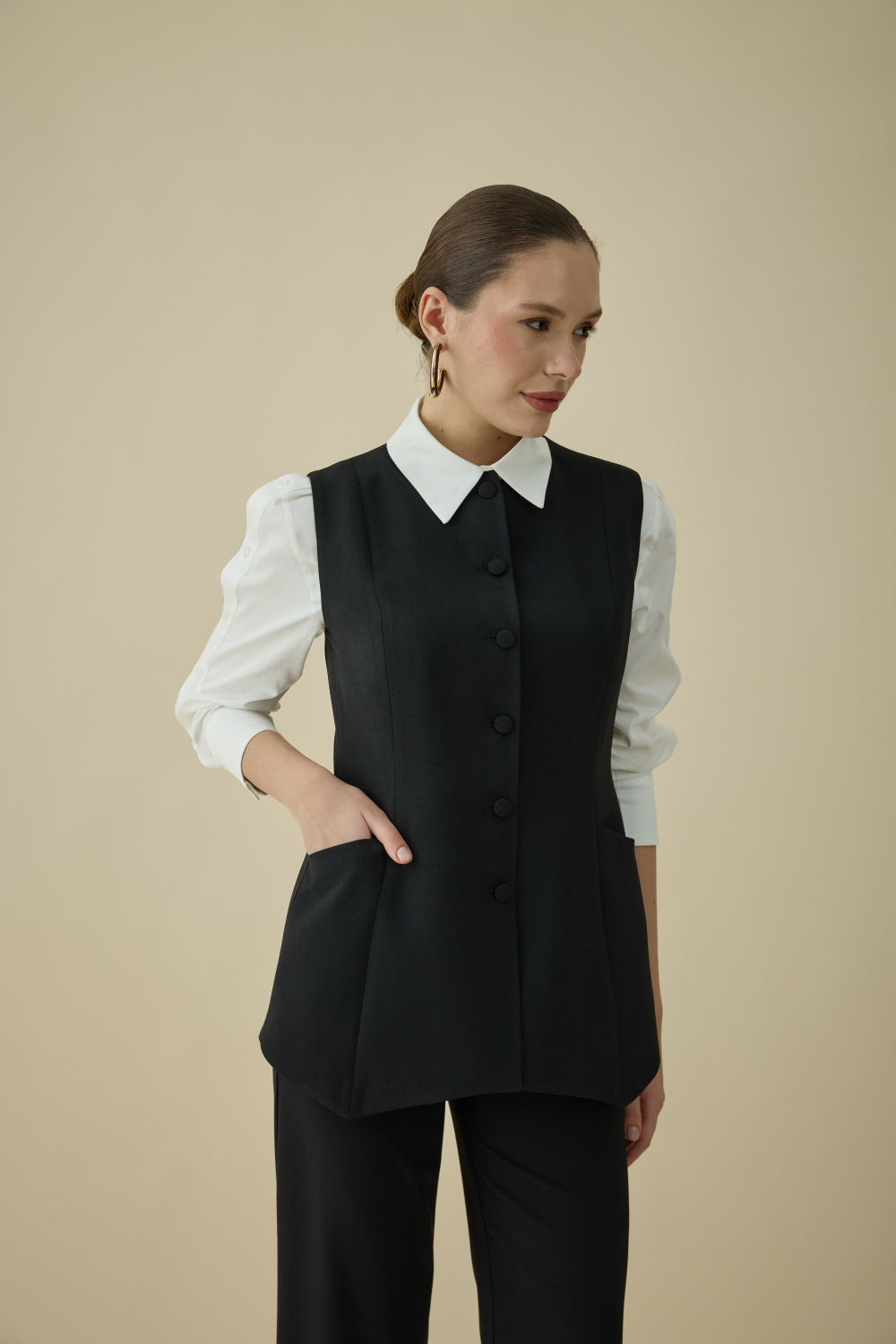 ASİMETRİK KESİMİYLE GÜNDÜZ VE GECEYE EŞLİK EDEN ŞIK YELEK TAKIM