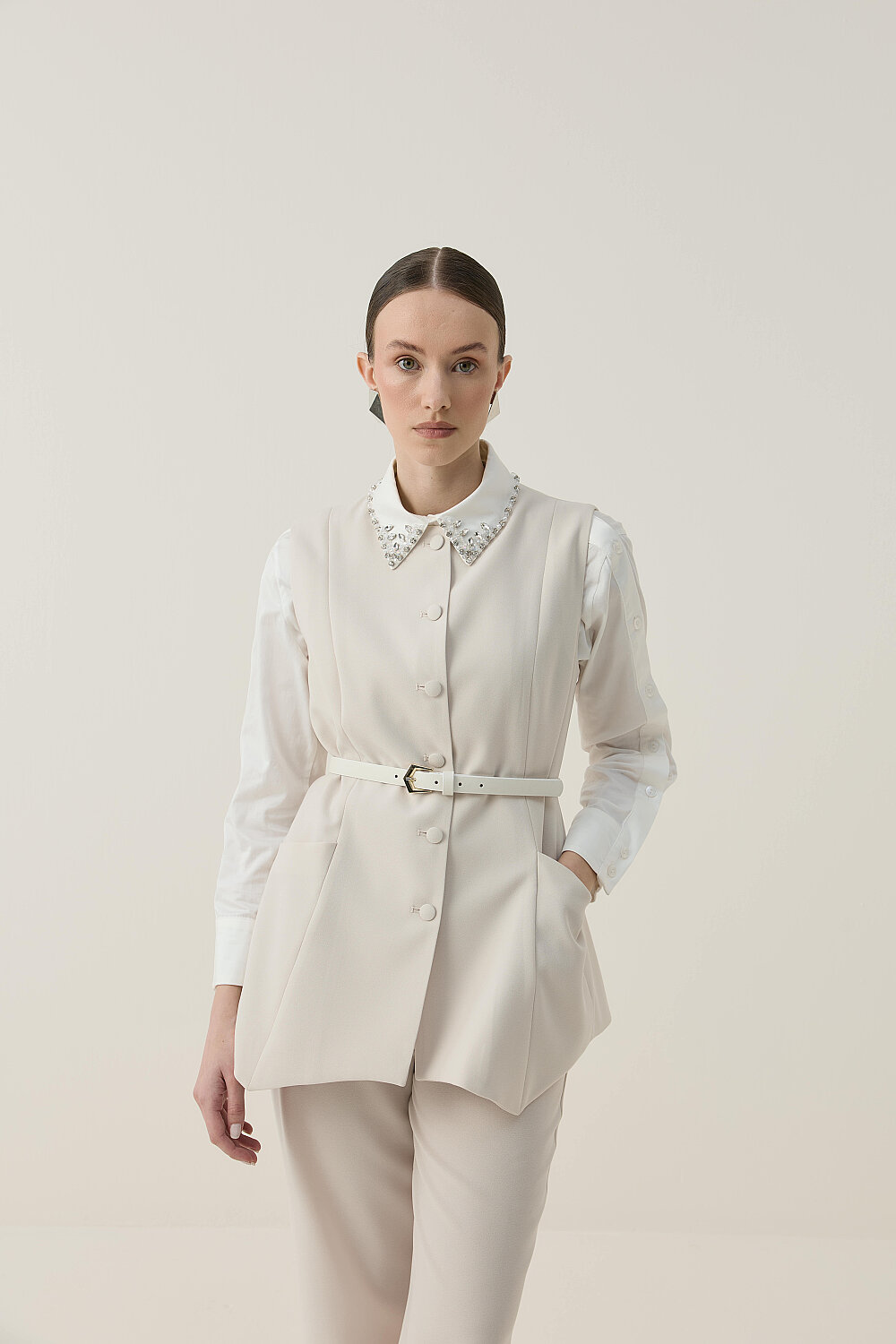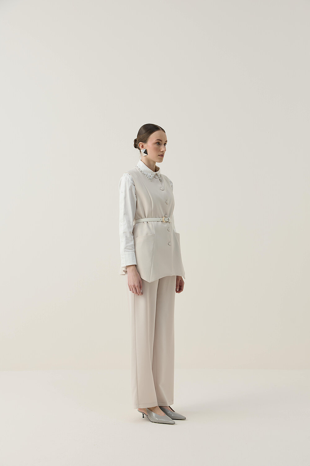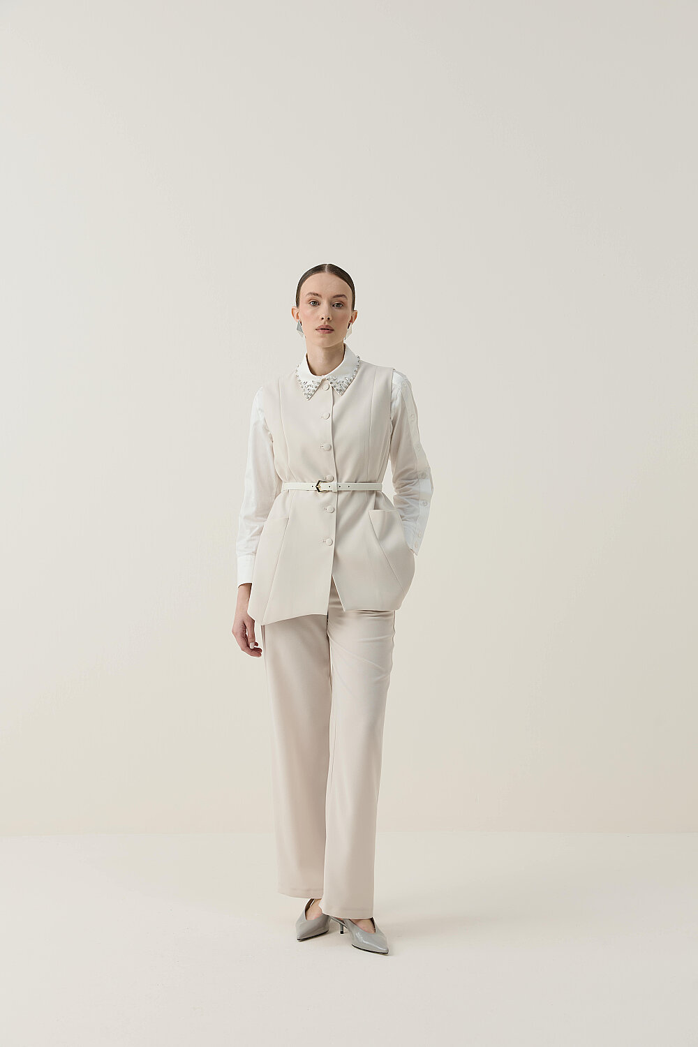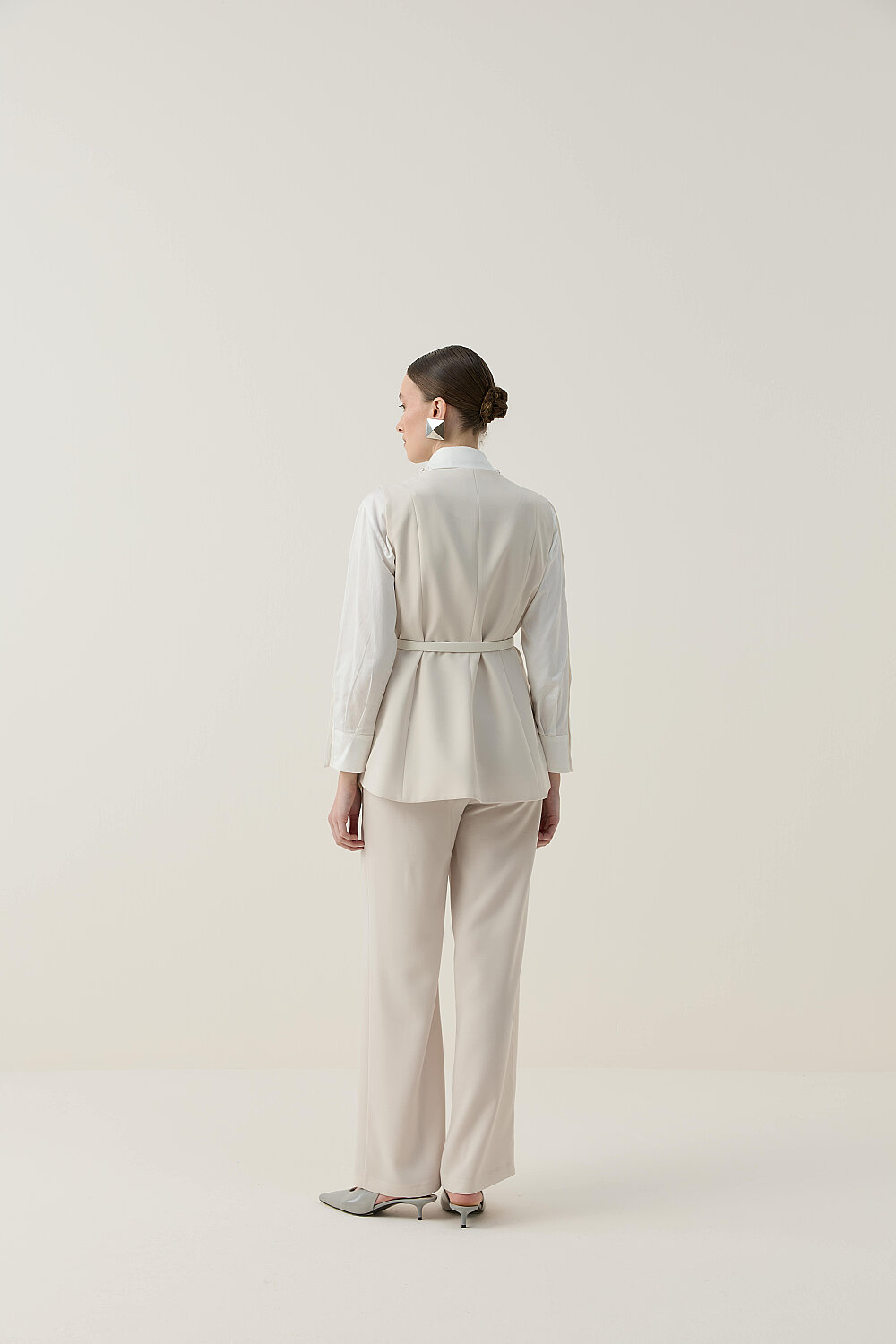 ASİMETRİK KESİMİYLE GÜNDÜZ VE GECEYE EŞLİK EDEN ŞIK YELEK TAKIM