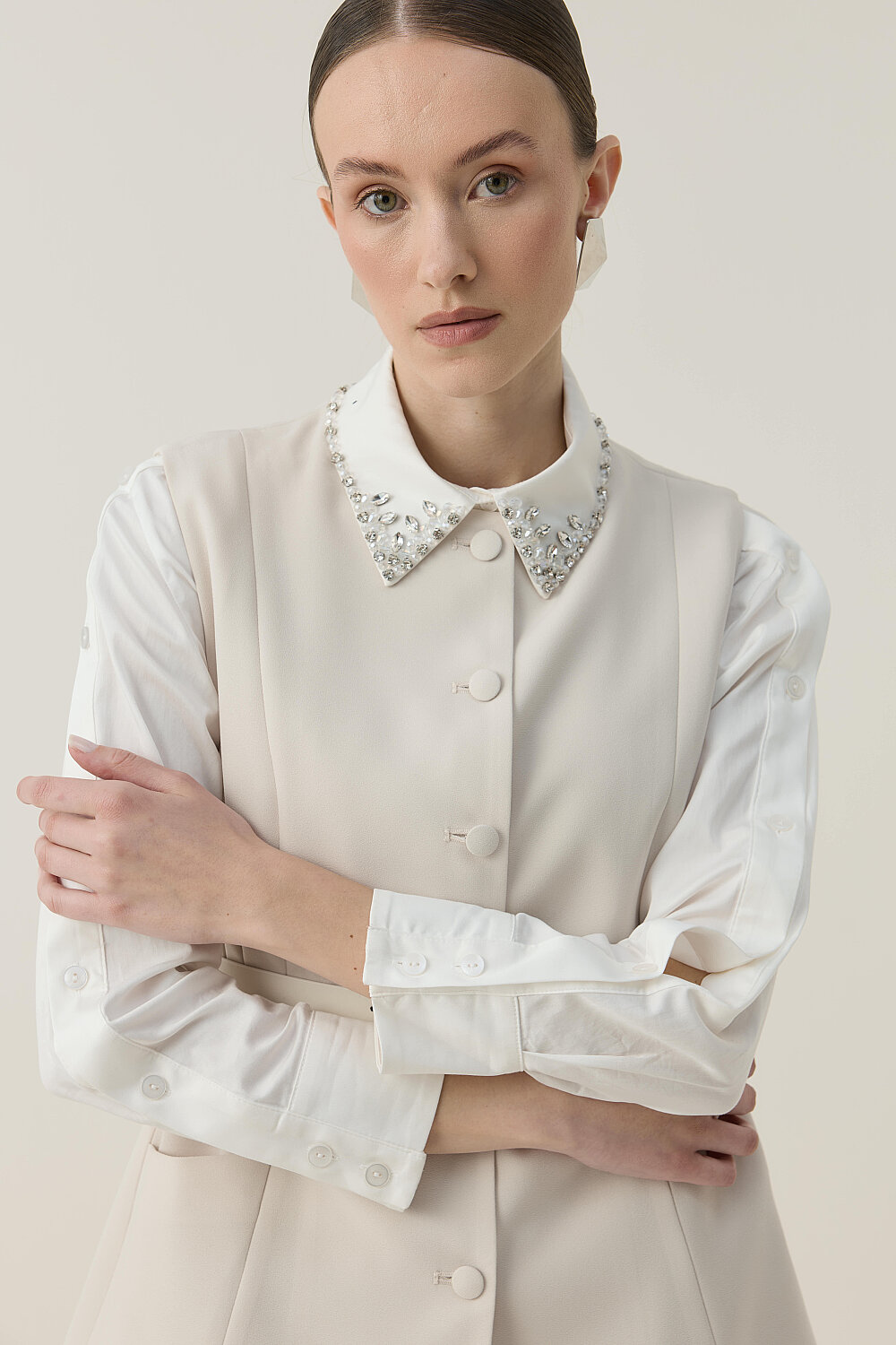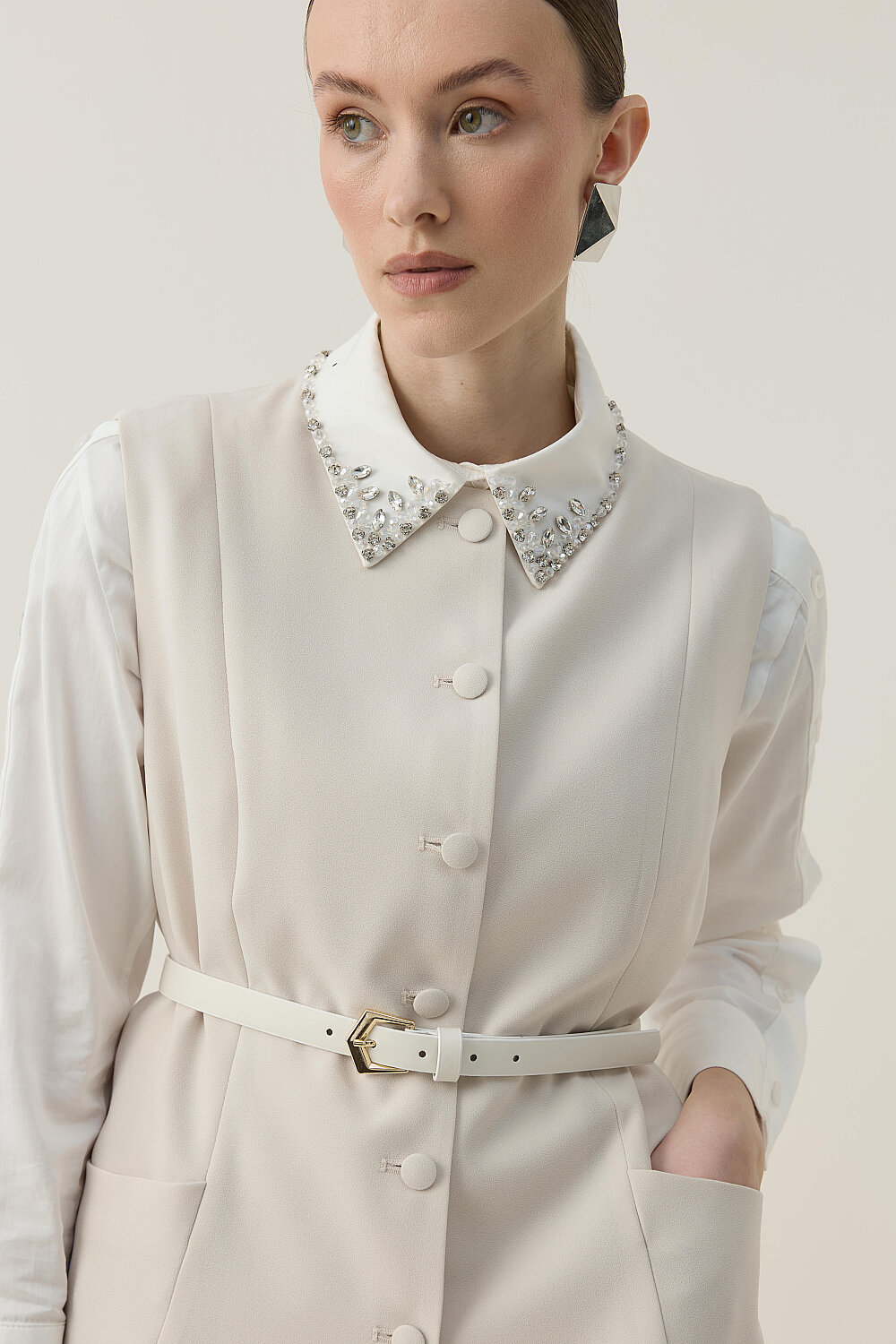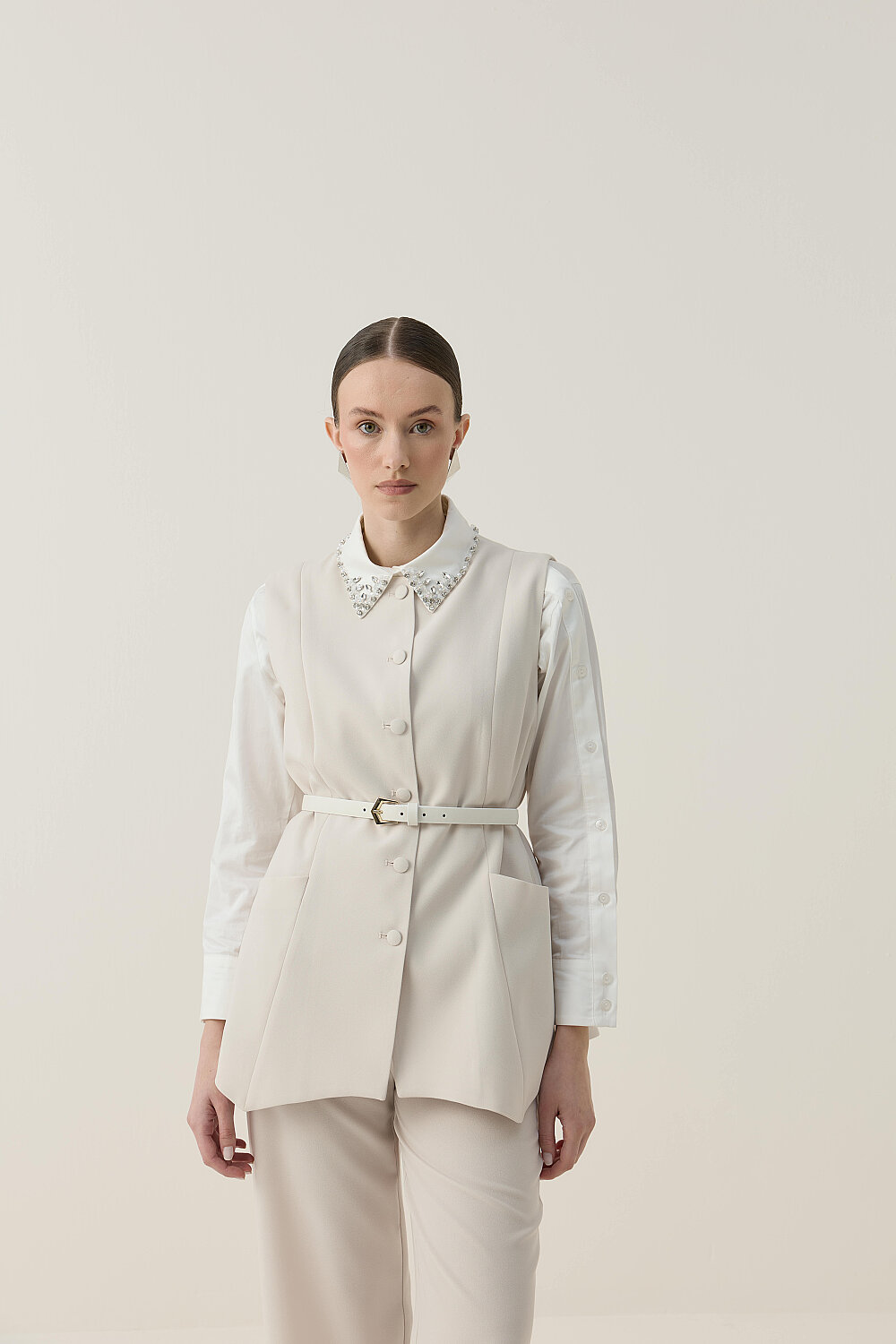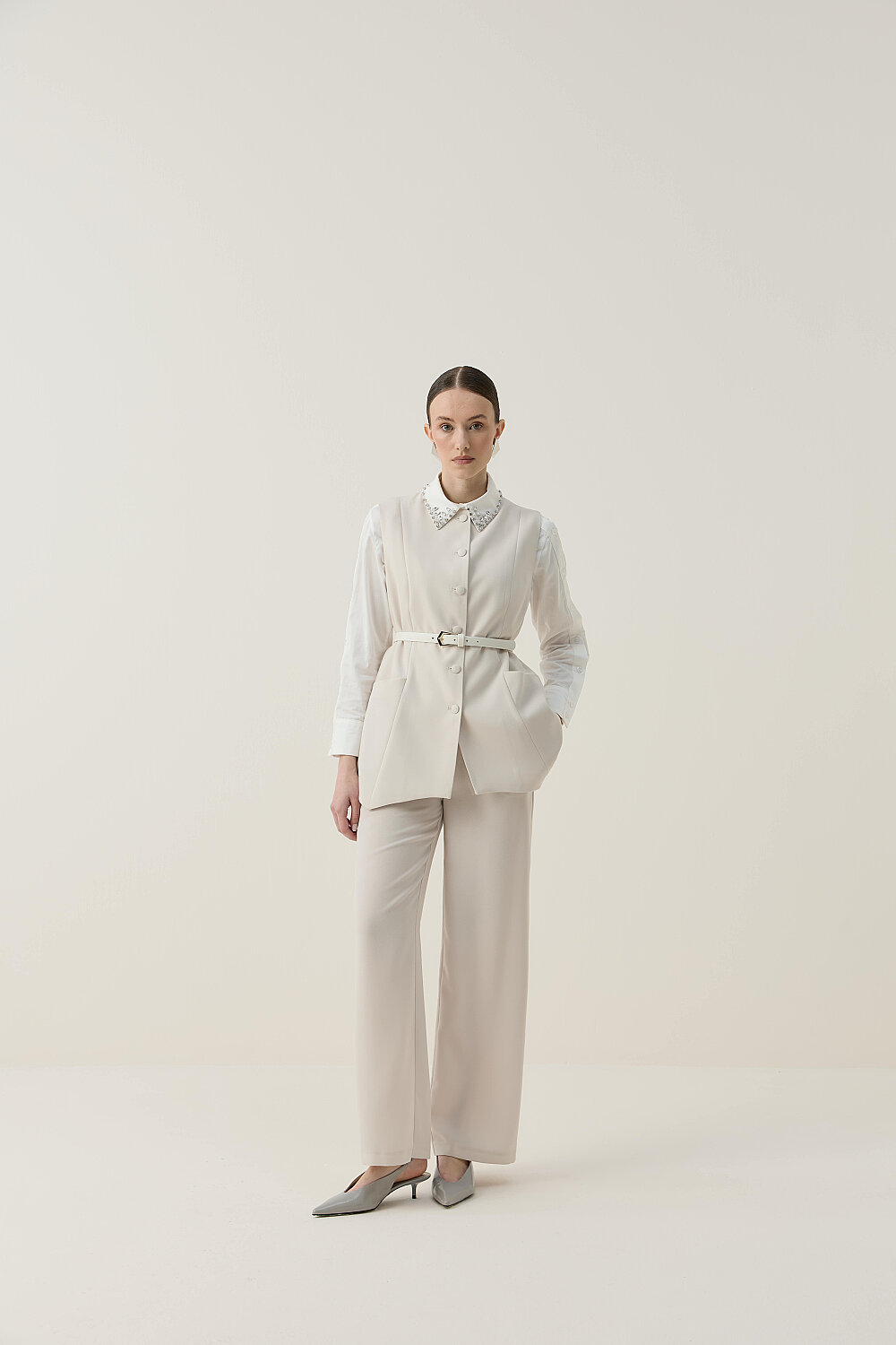 ASİMETRİK KESİMİYLE GÜNDÜZ VE GECEYE EŞLİK EDEN ŞIK YELEK TAKIM
