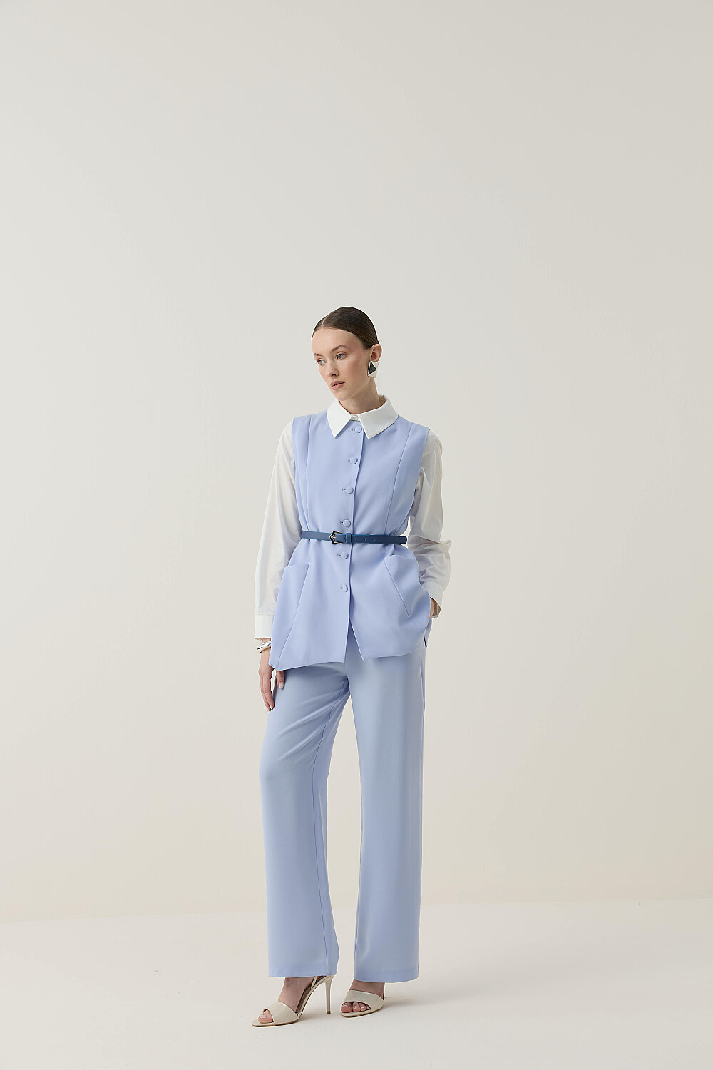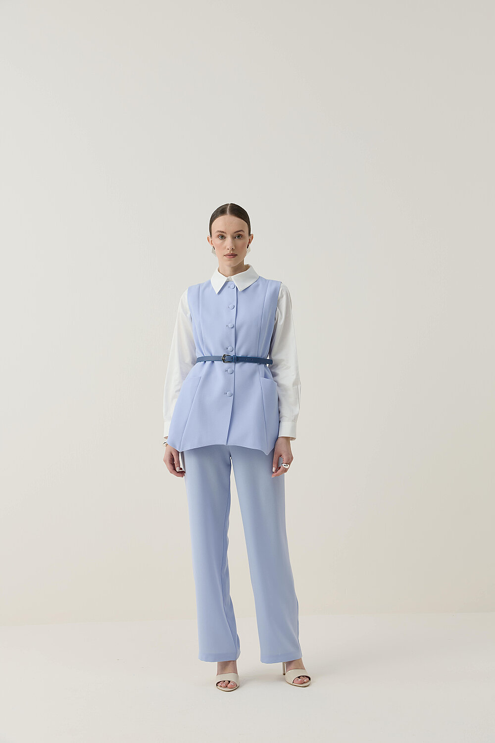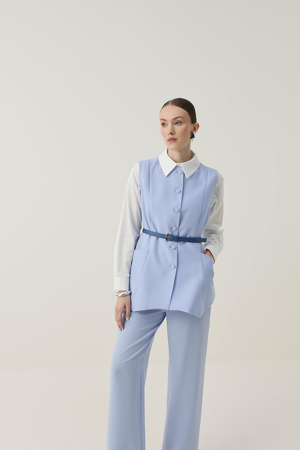 ASİMETRİK KESİMİYLE GÜNDÜZ VE GECEYE EŞLİK EDEN ŞIK YELEK TAKIM