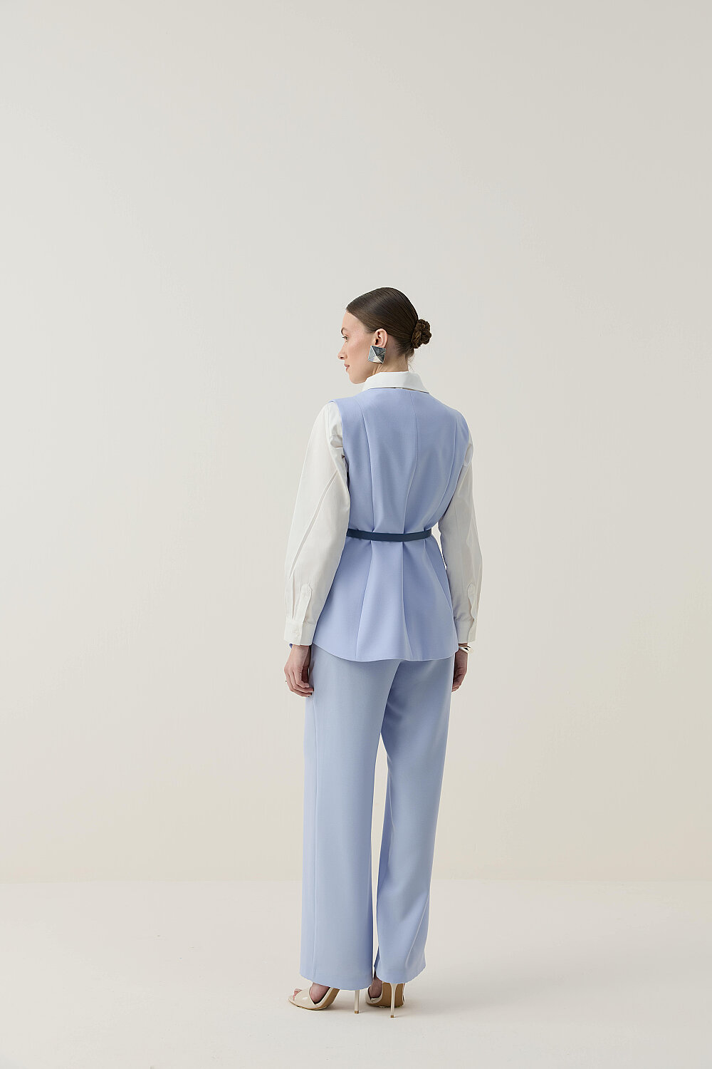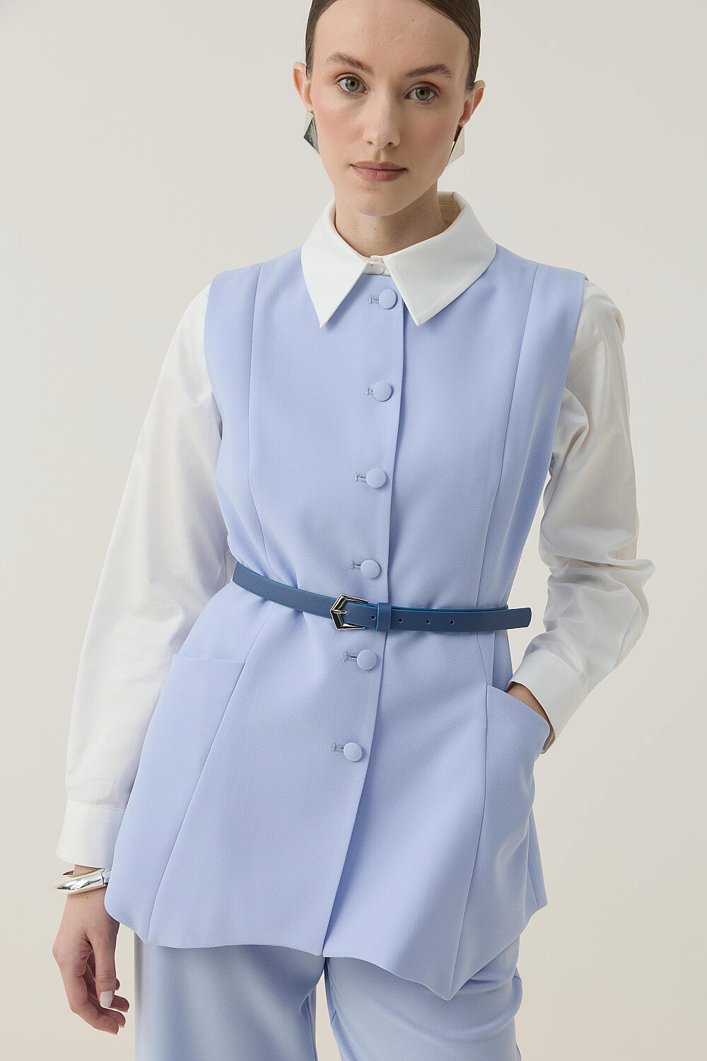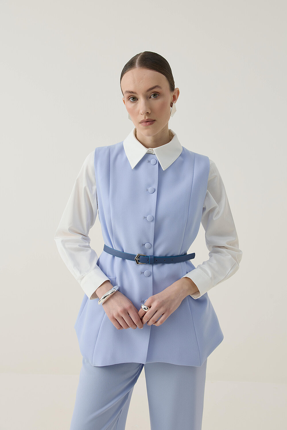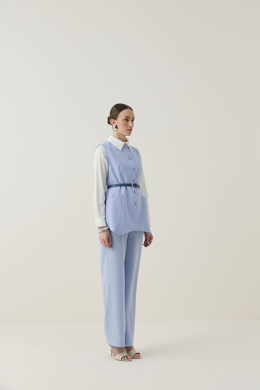 ASİMETRİK KESİMİYLE GÜNDÜZ VE GECEYE EŞLİK EDEN ŞIK YELEK TAKIM