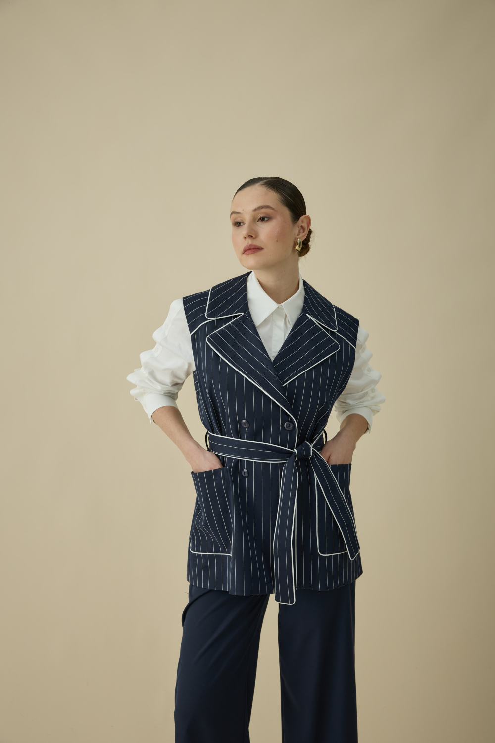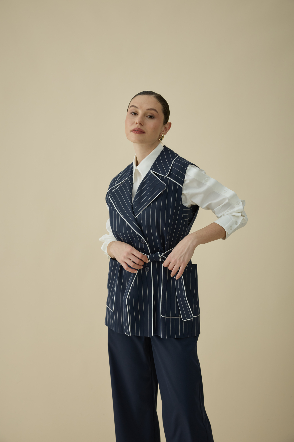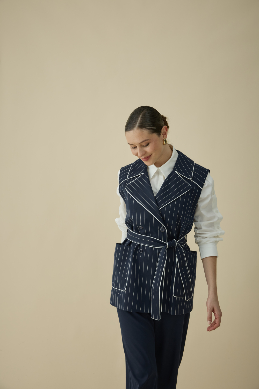 KEMER DETAYLI ÇİZGİLİ YELEK TAKIM