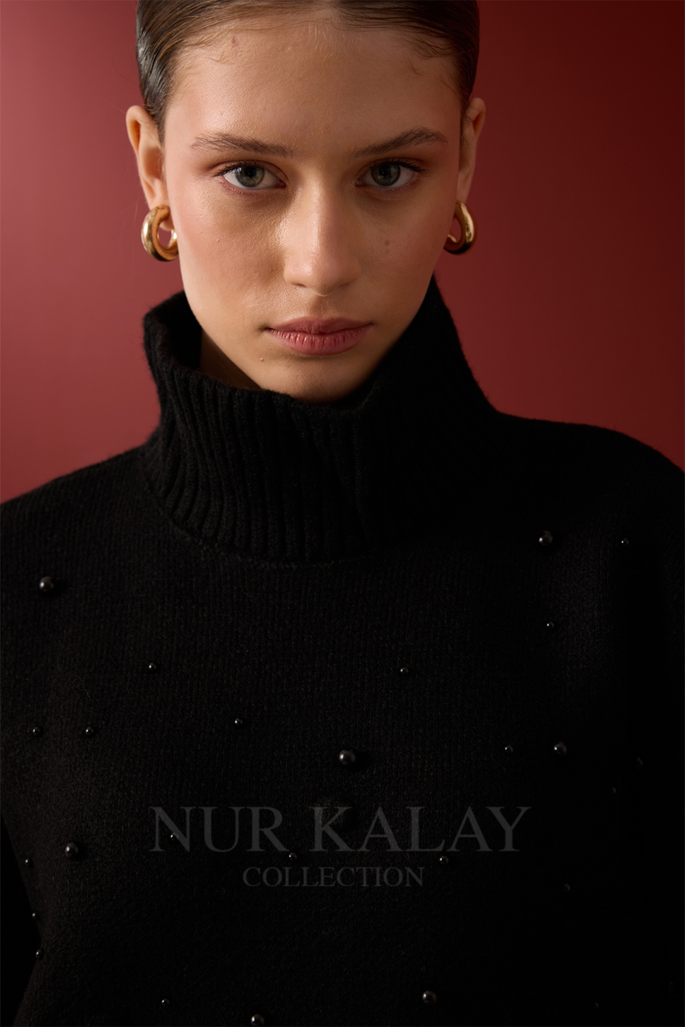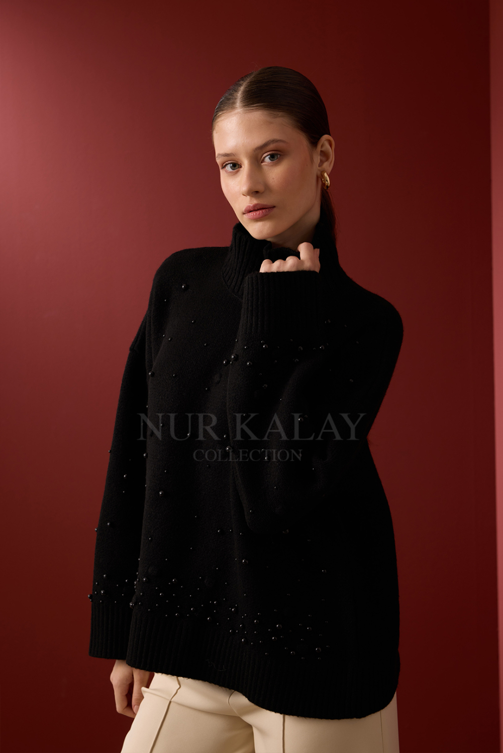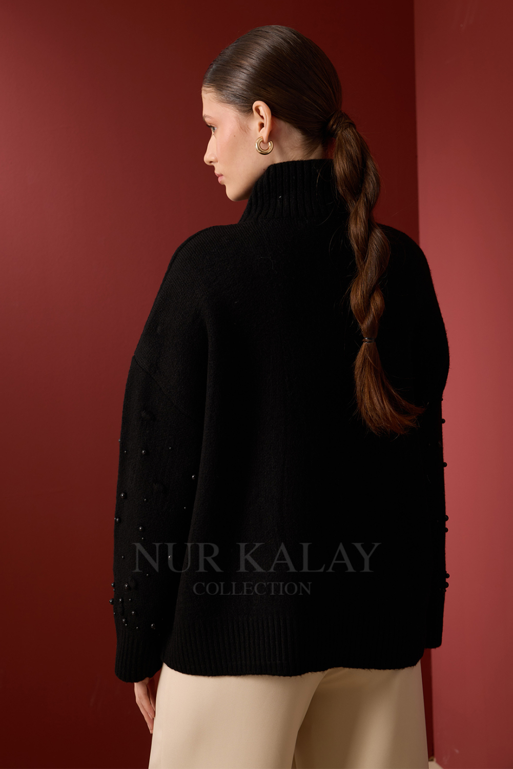 İNCİ DETAYLI TRİKO KAZAK SİYAH
