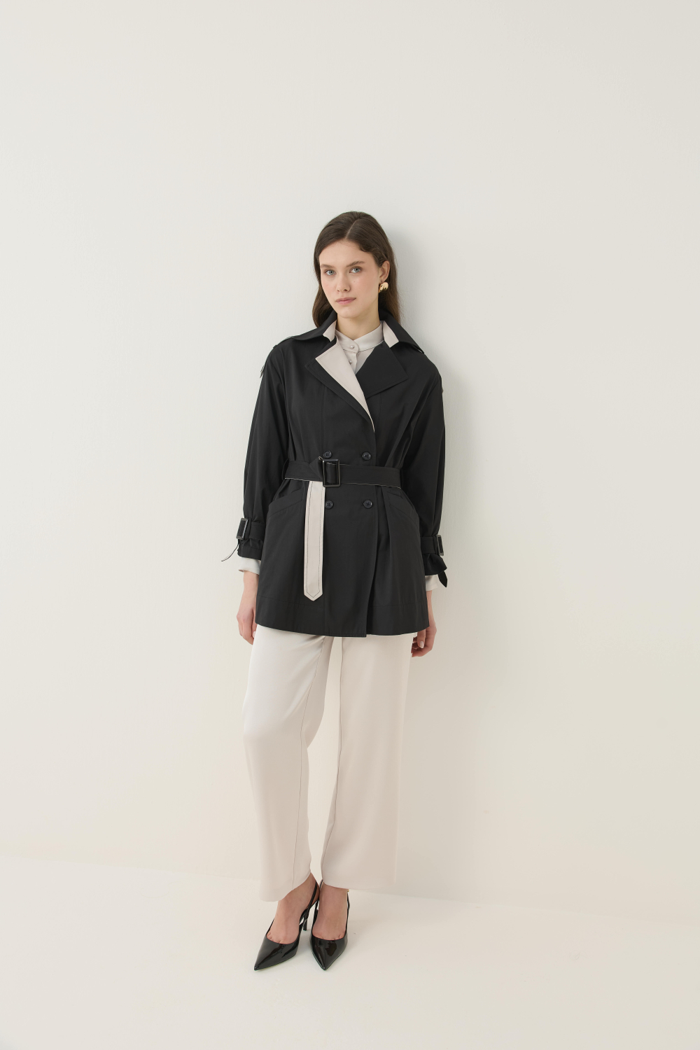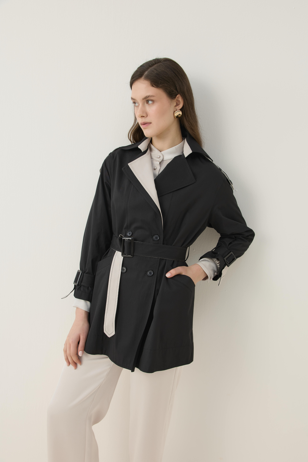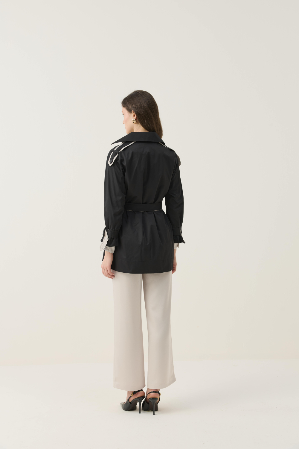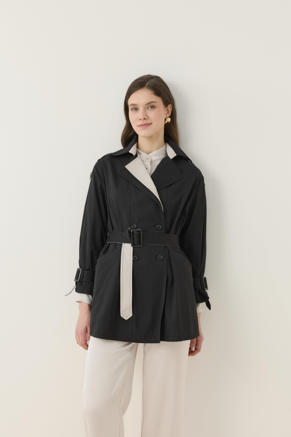 KONTRAST RENK DETAYIYLA HEM ŞIK HEM DE GÜNLÜK KULLANIMA UYGUN KISA TRENÇKOT