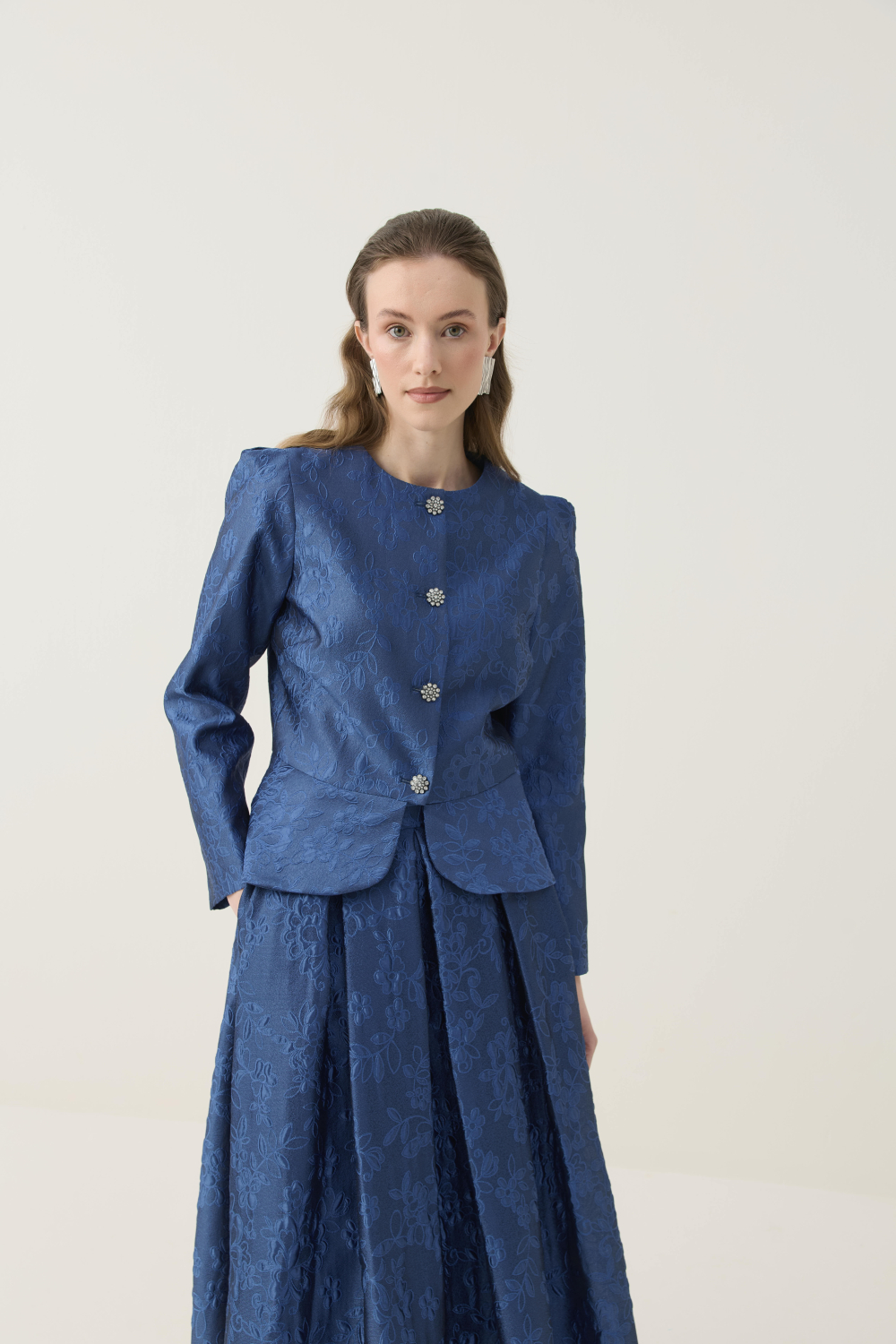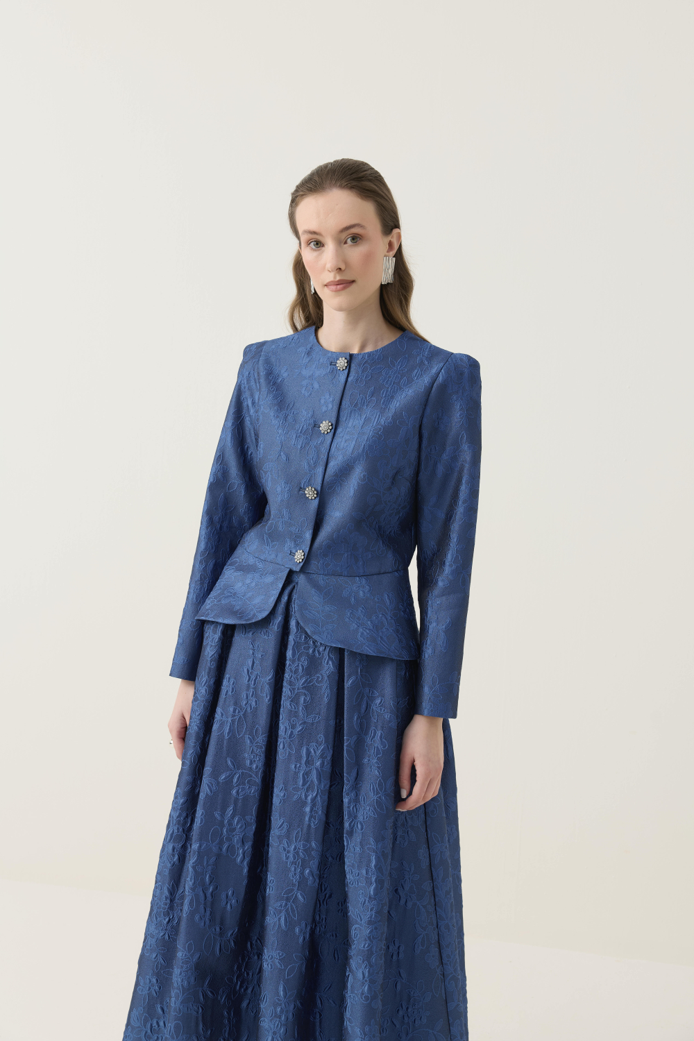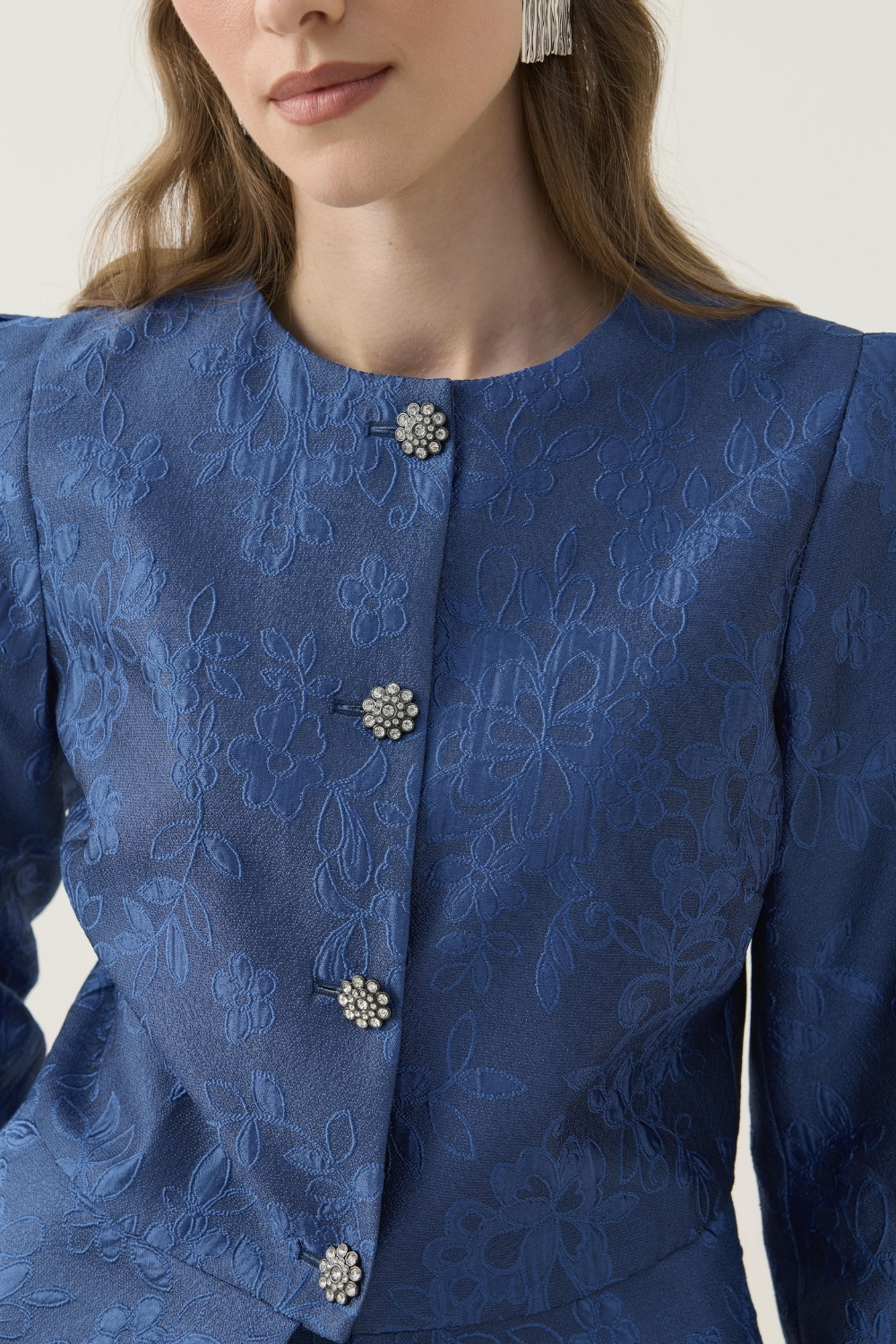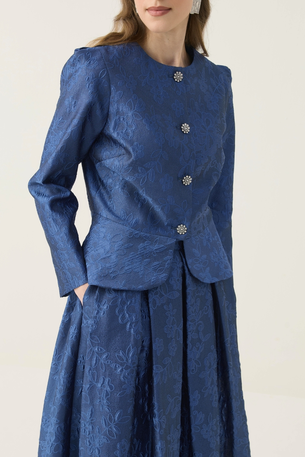 KRİSTAL DÜĞME DETAYLI JAKAR CEKET ETEK TAKIM LACİVERT