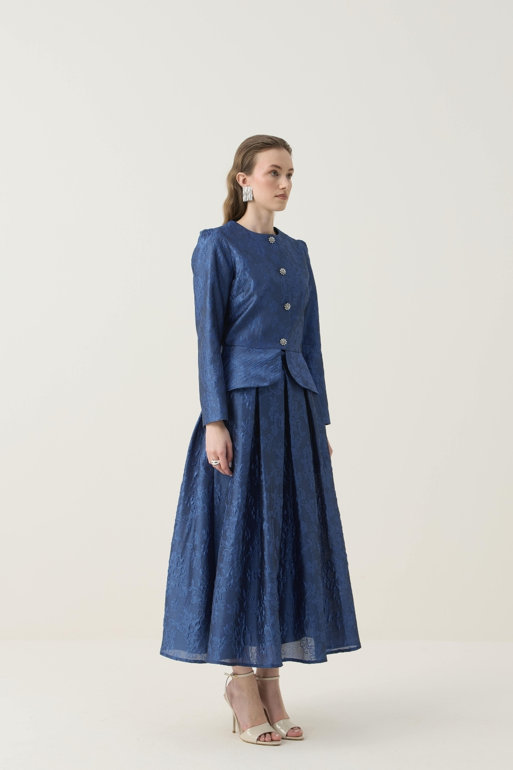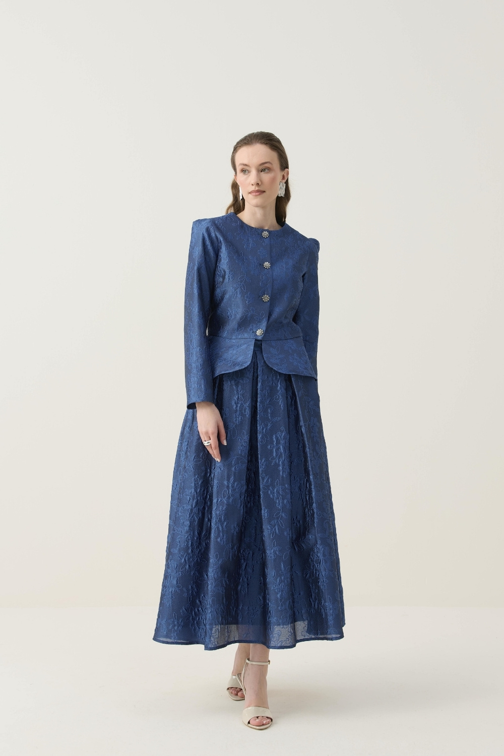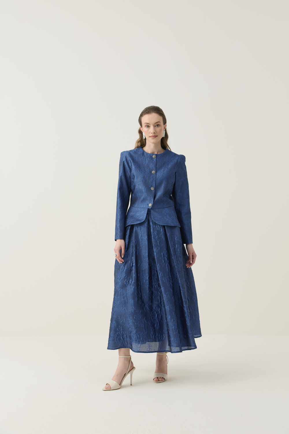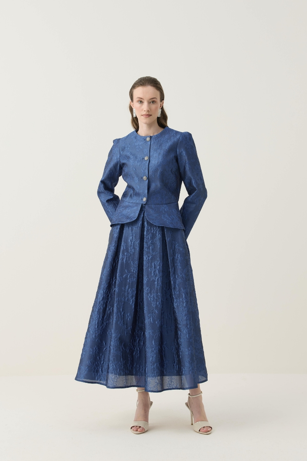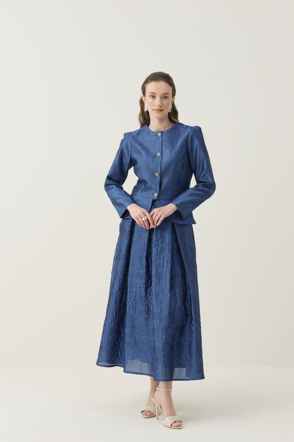 KRİSTAL DÜĞME DETAYLI JAKAR CEKET ETEK TAKIM LACİVERT