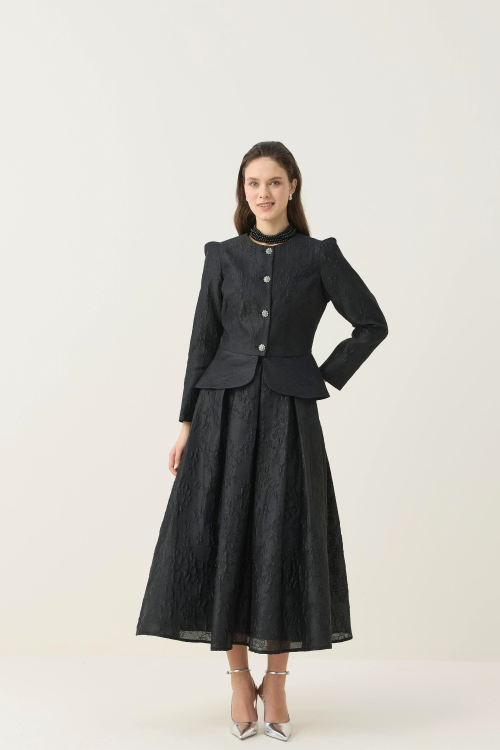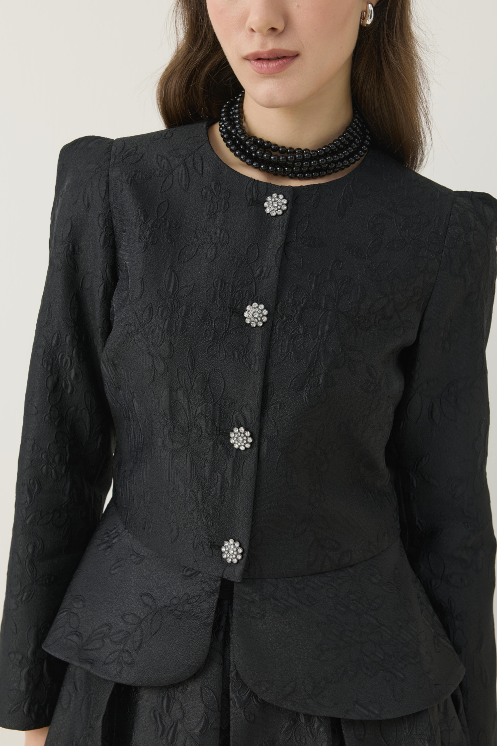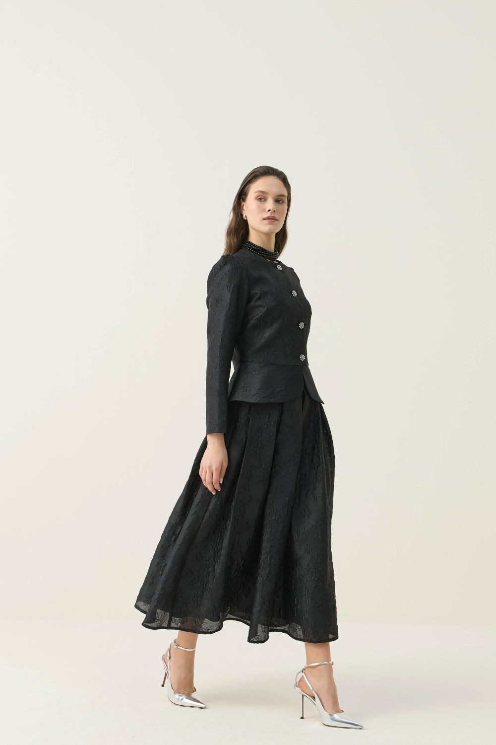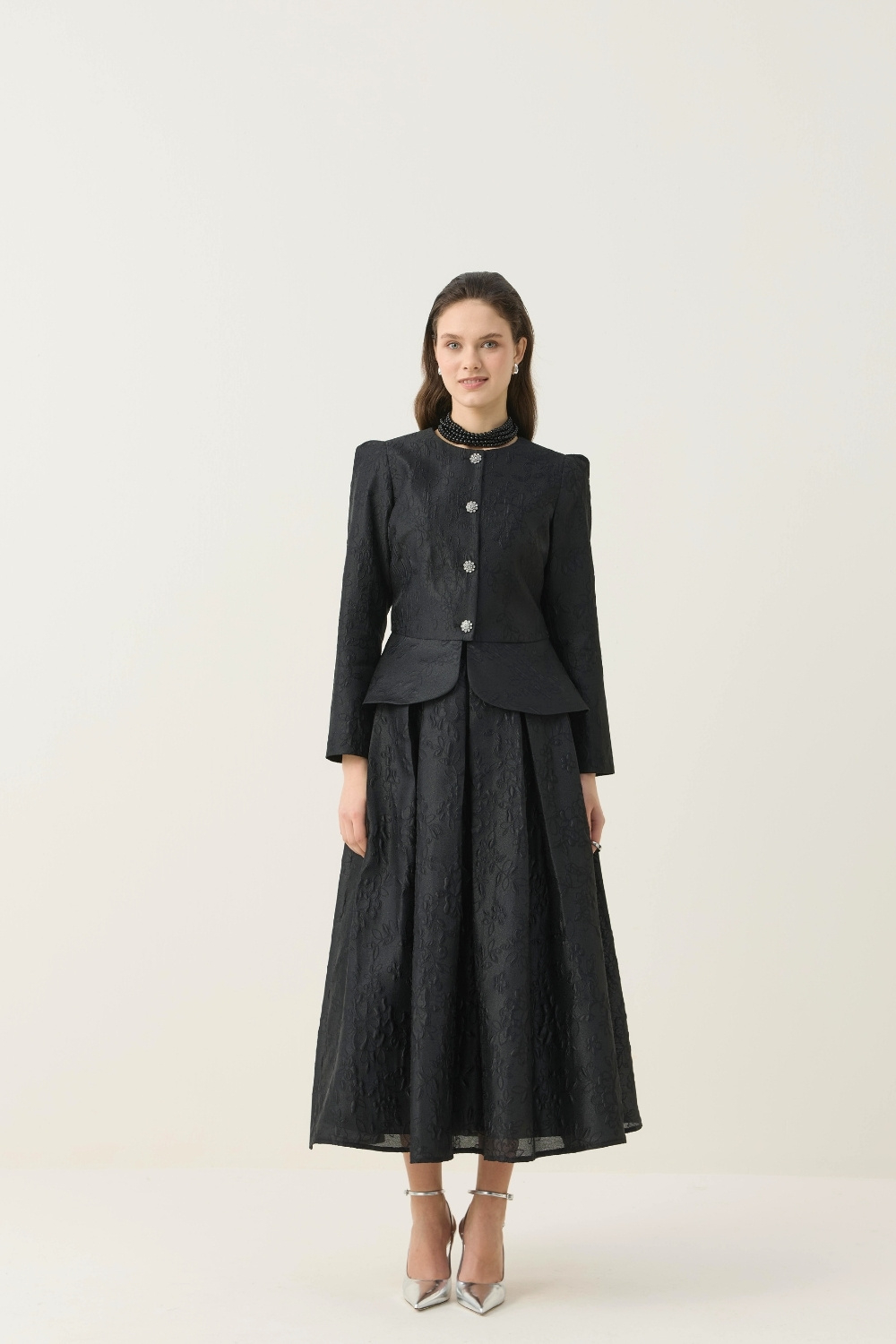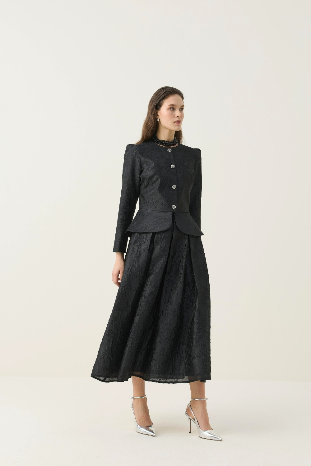 KRİSTAL DÜĞME DETAYLI JAKAR CEKET ETEK TAKIM SİYAH
