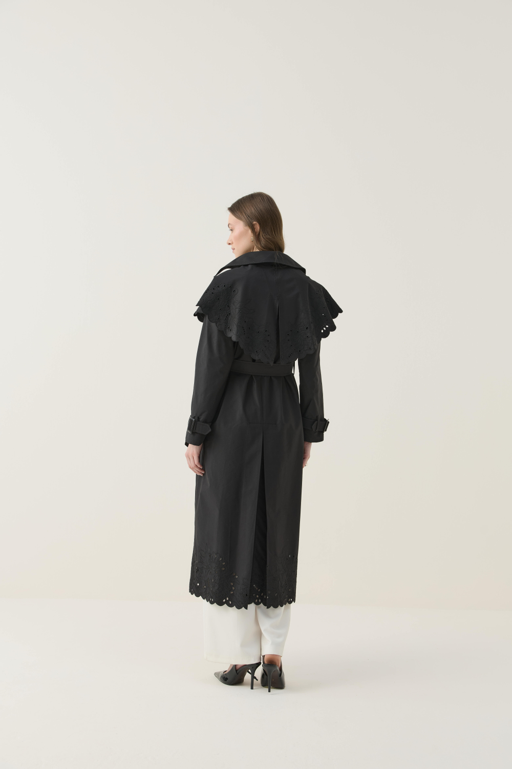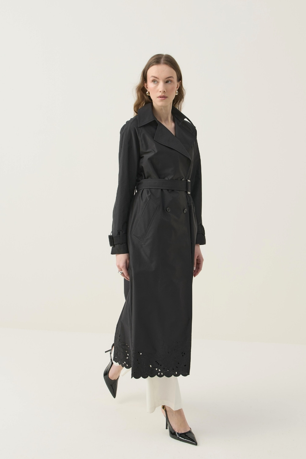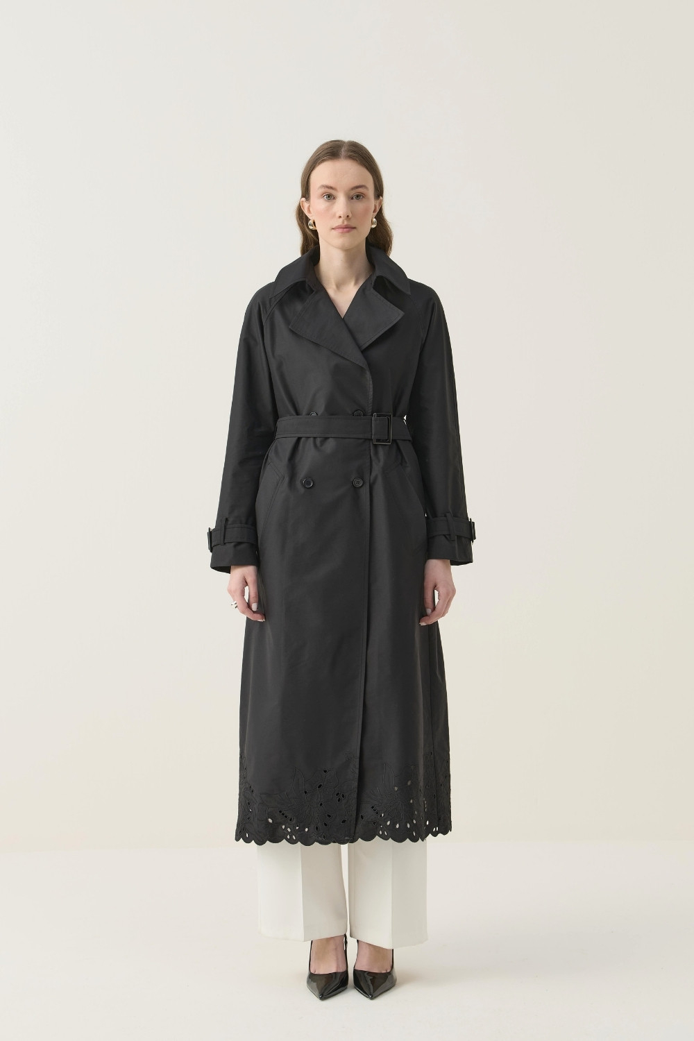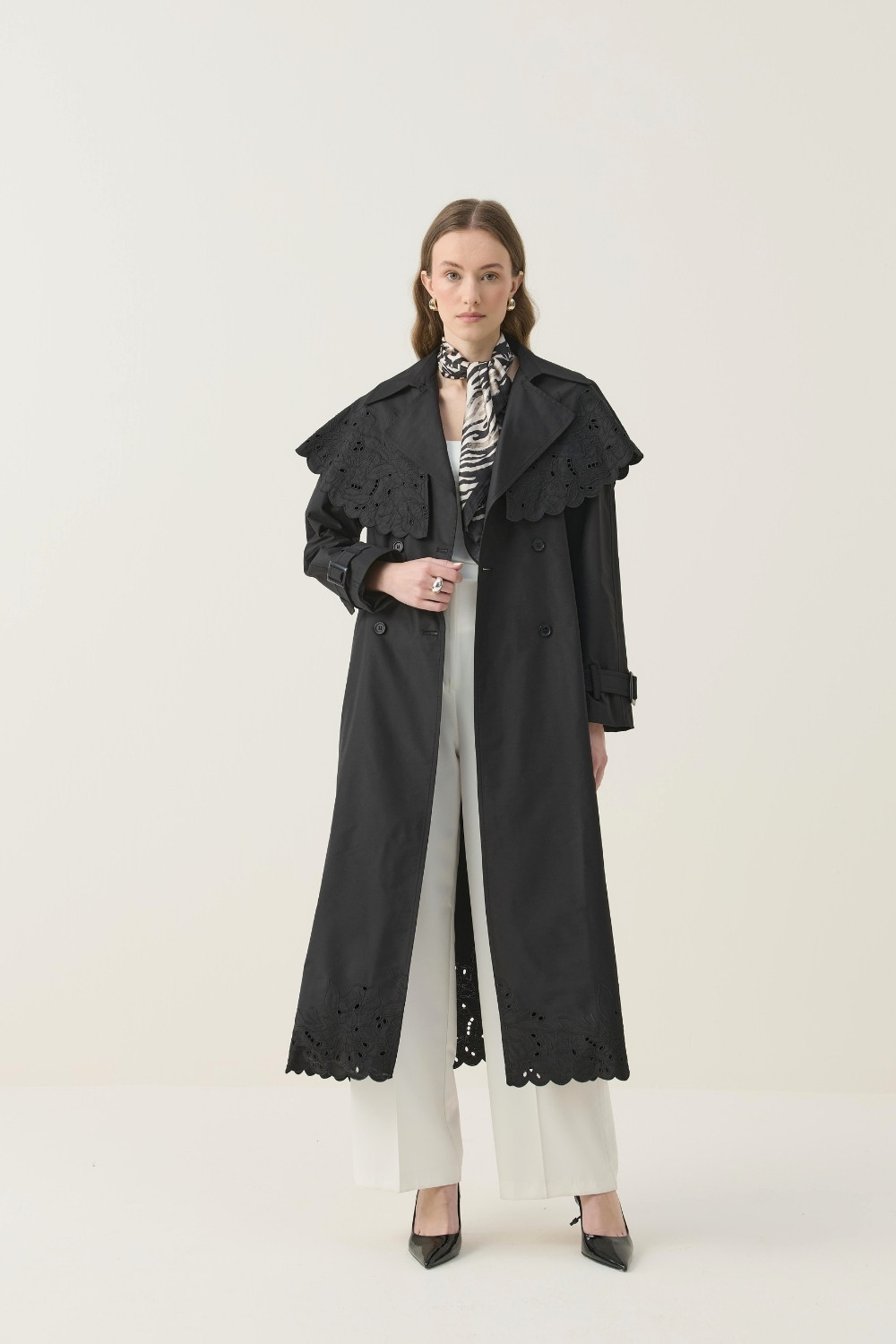 SEYYAR RÜZGARLIK DETAYLI NAKIŞLI TRENÇKOT SİYAH