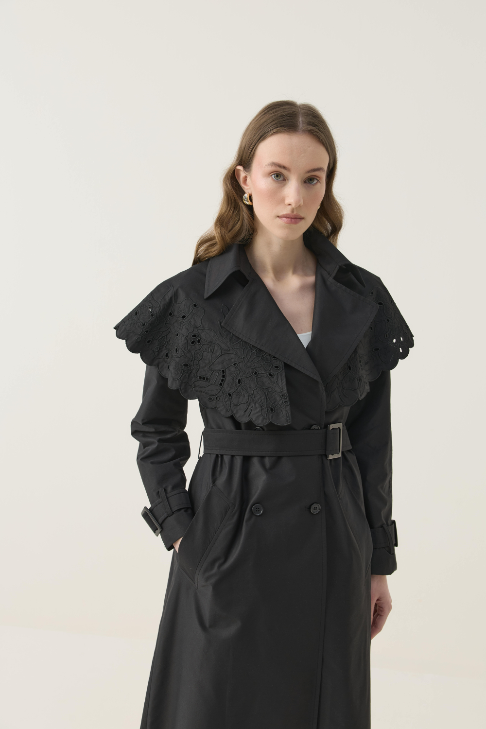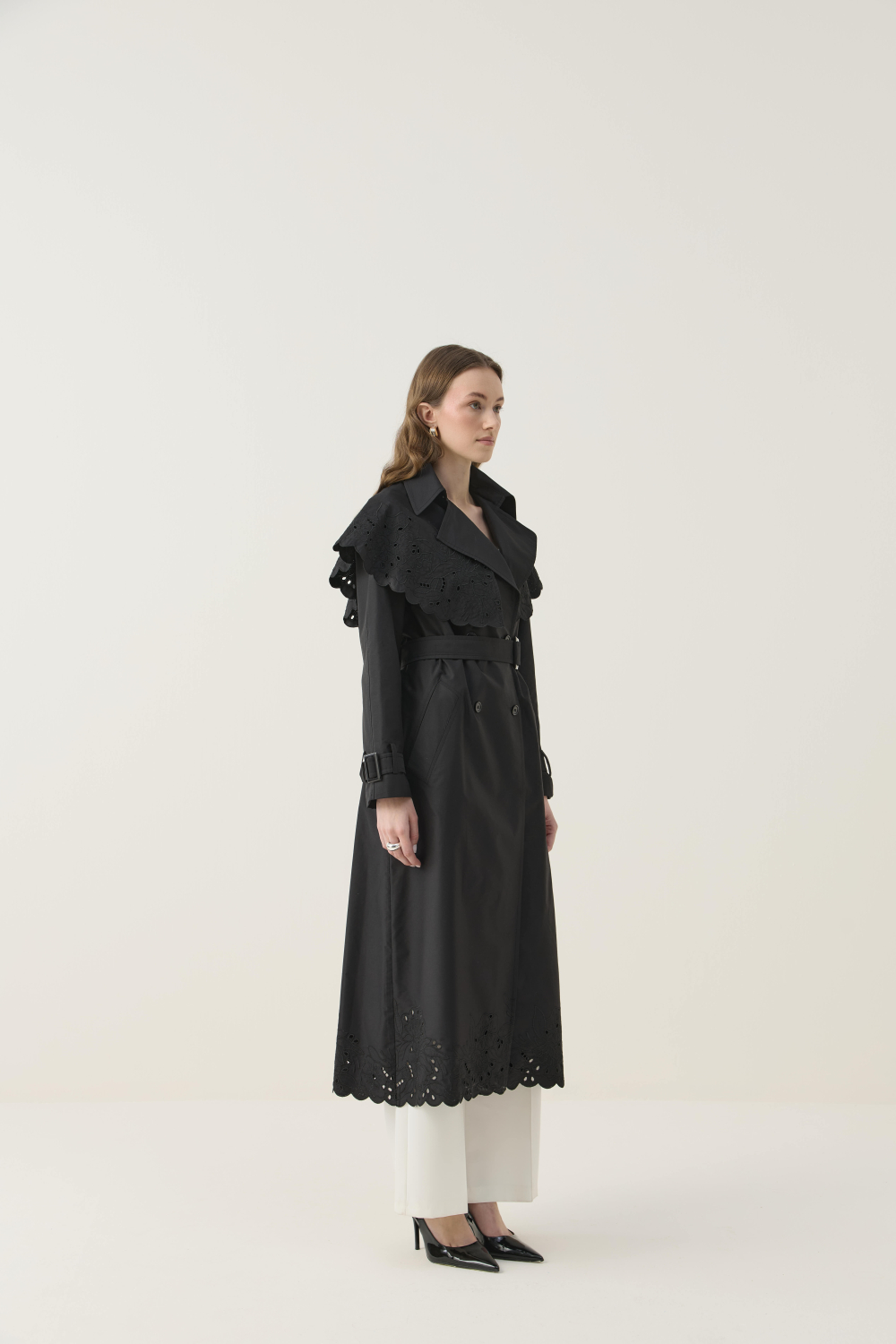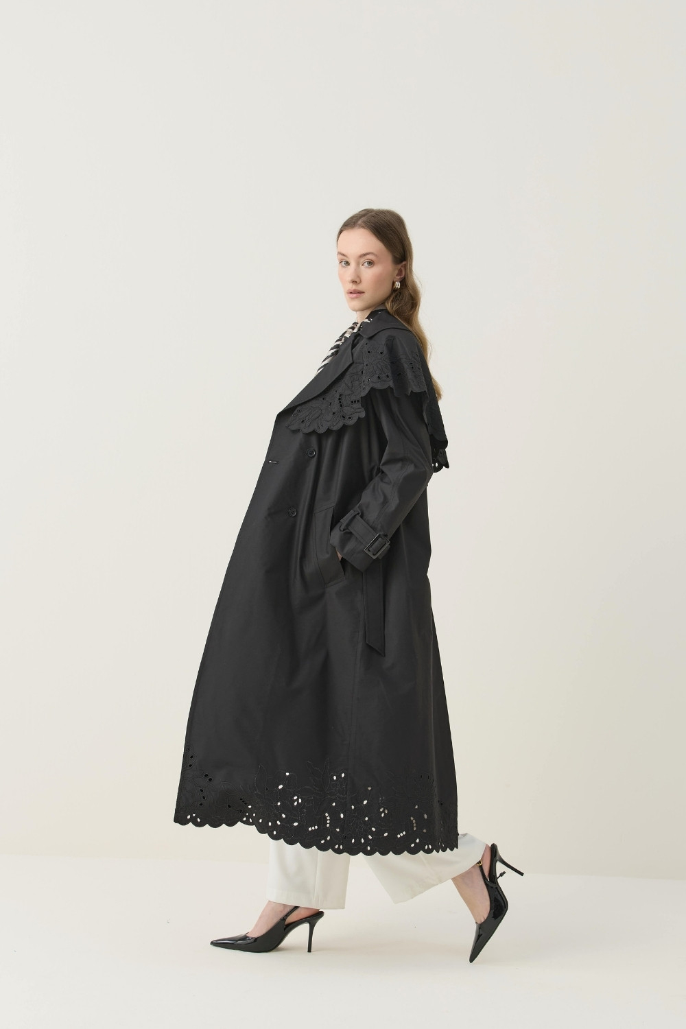 SEYYAR RÜZGARLIK DETAYLI NAKIŞLI TRENÇKOT SİYAH