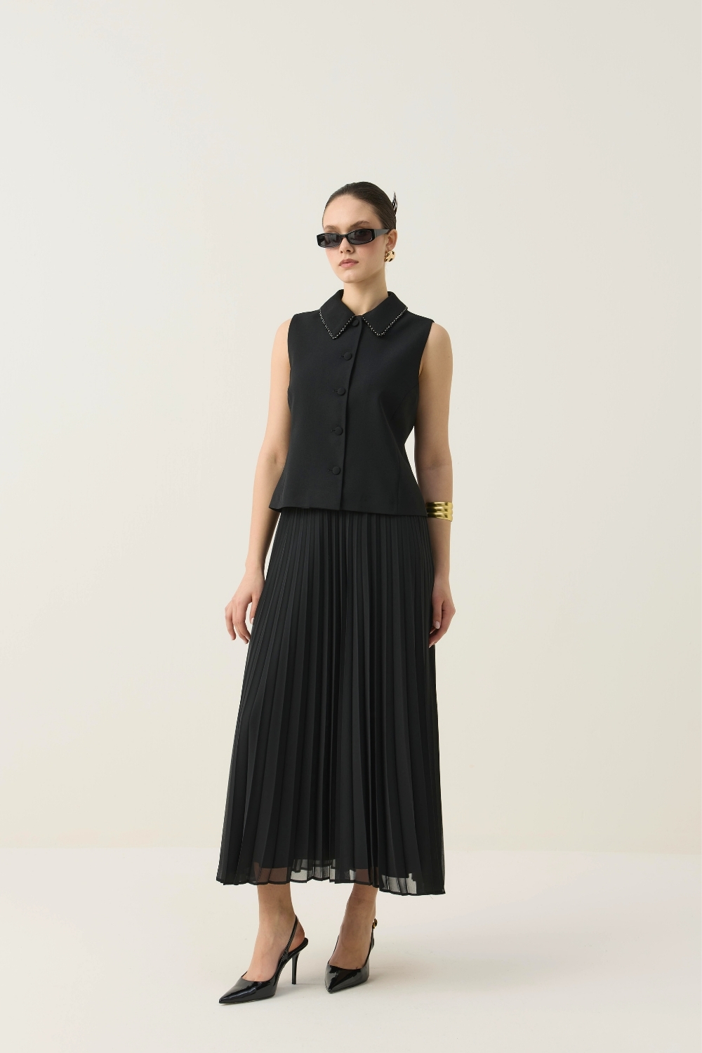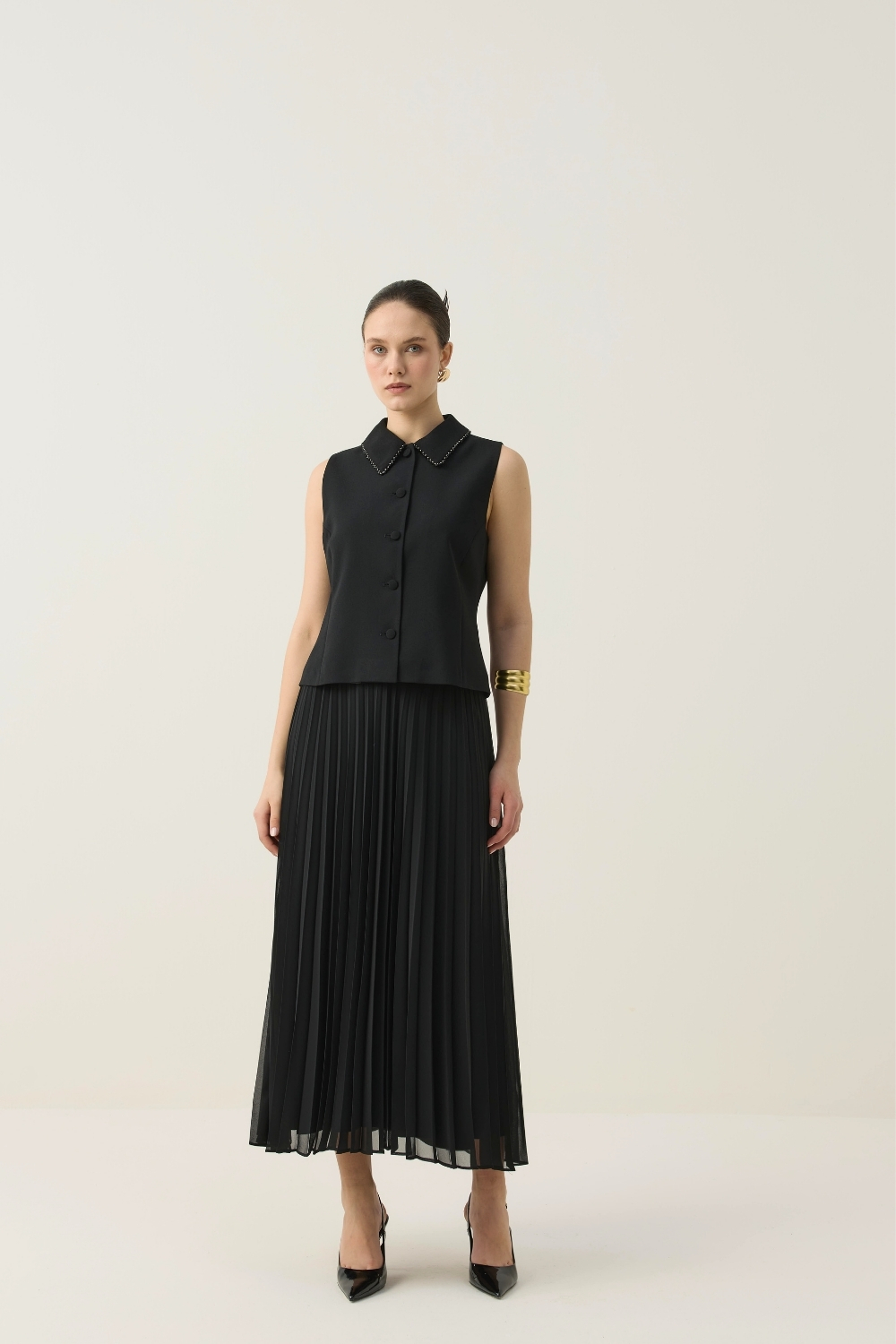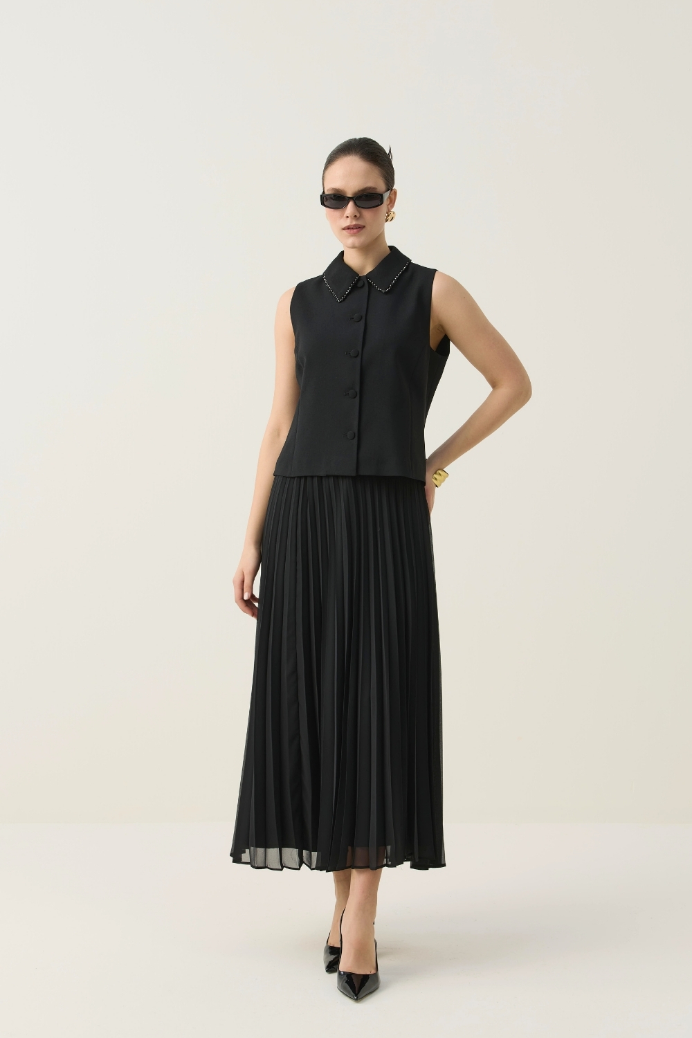 Gelince Haber VerYAKASI İŞLEME TAŞ DETAYLI PİLİSE ETEKLİ YELEK TAKIM
