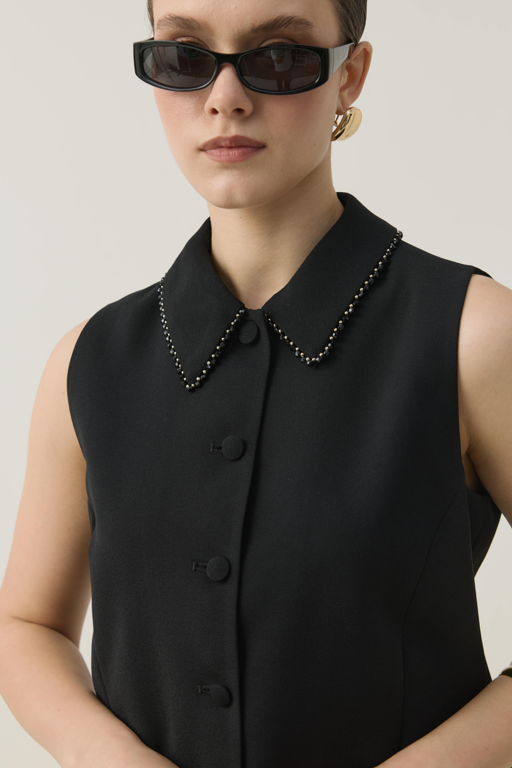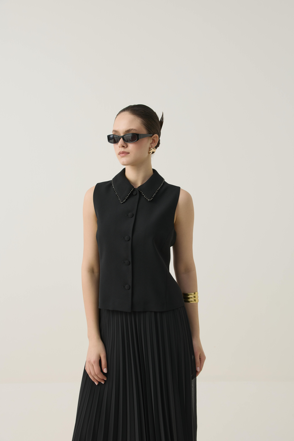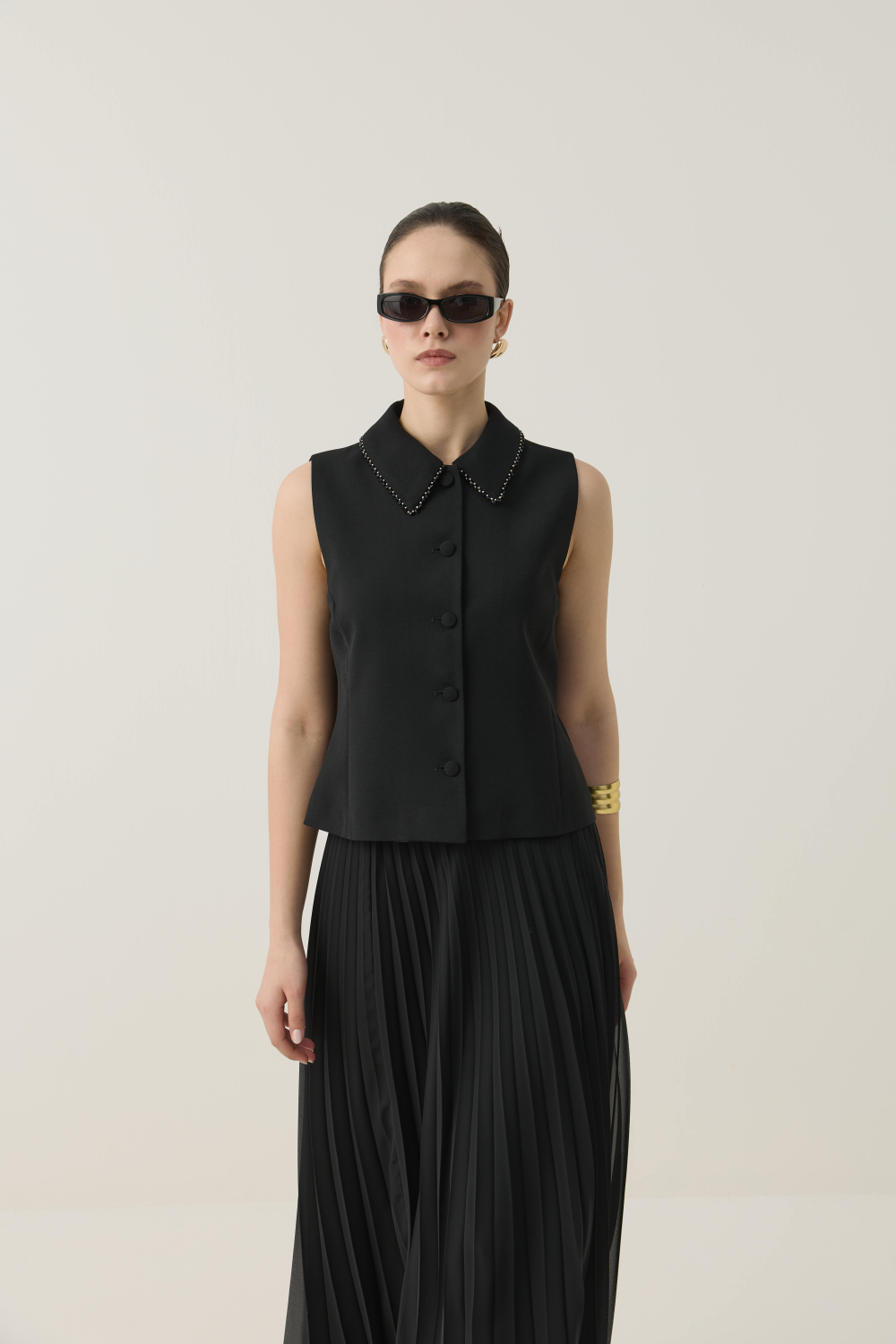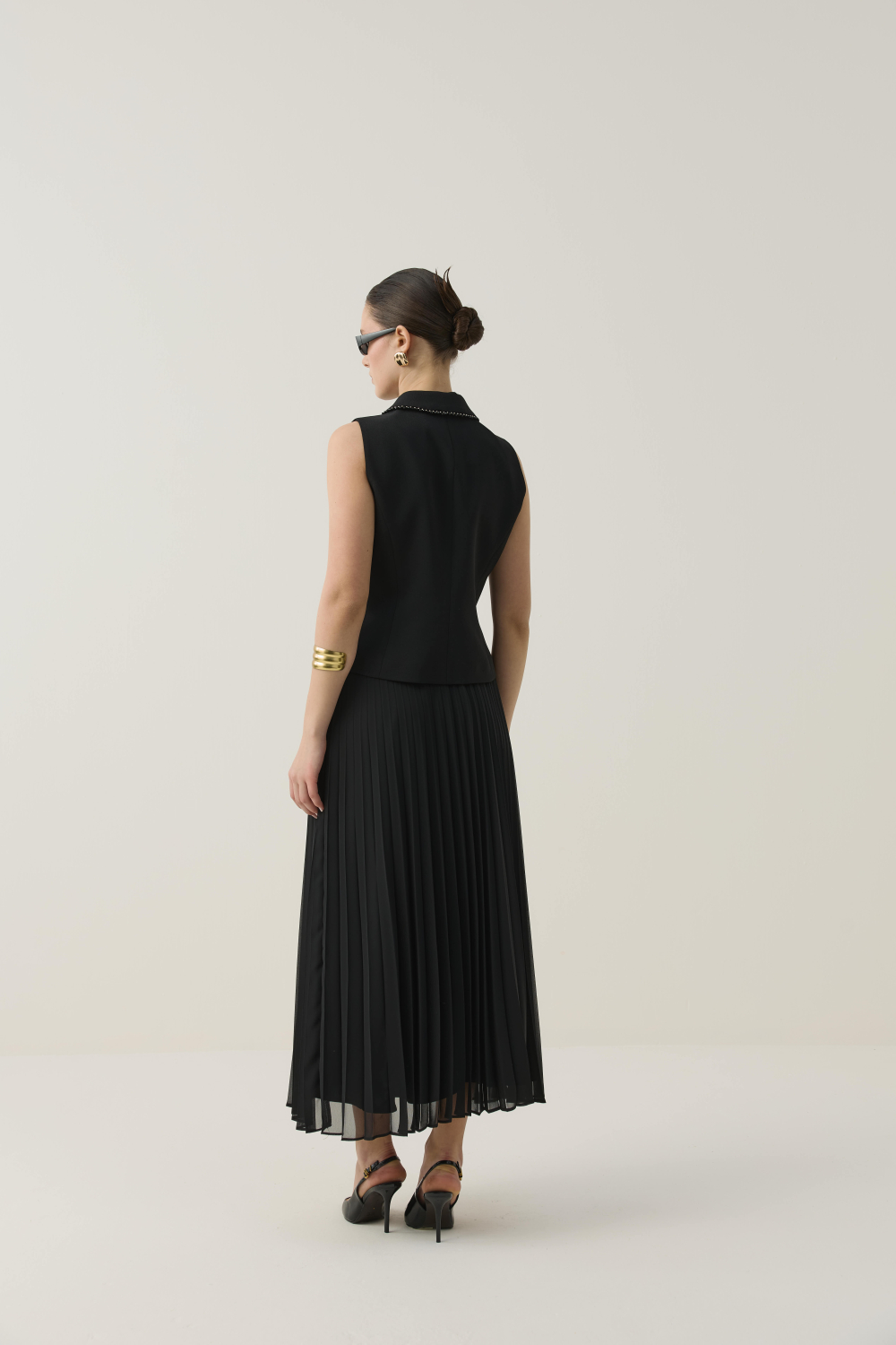 Gelince Haber VerYAKASI İŞLEME TAŞ DETAYLI PİLİSE ETEKLİ YELEK TAKIM