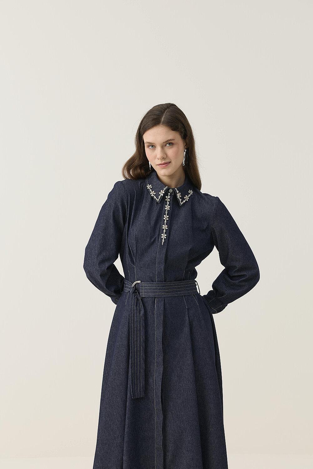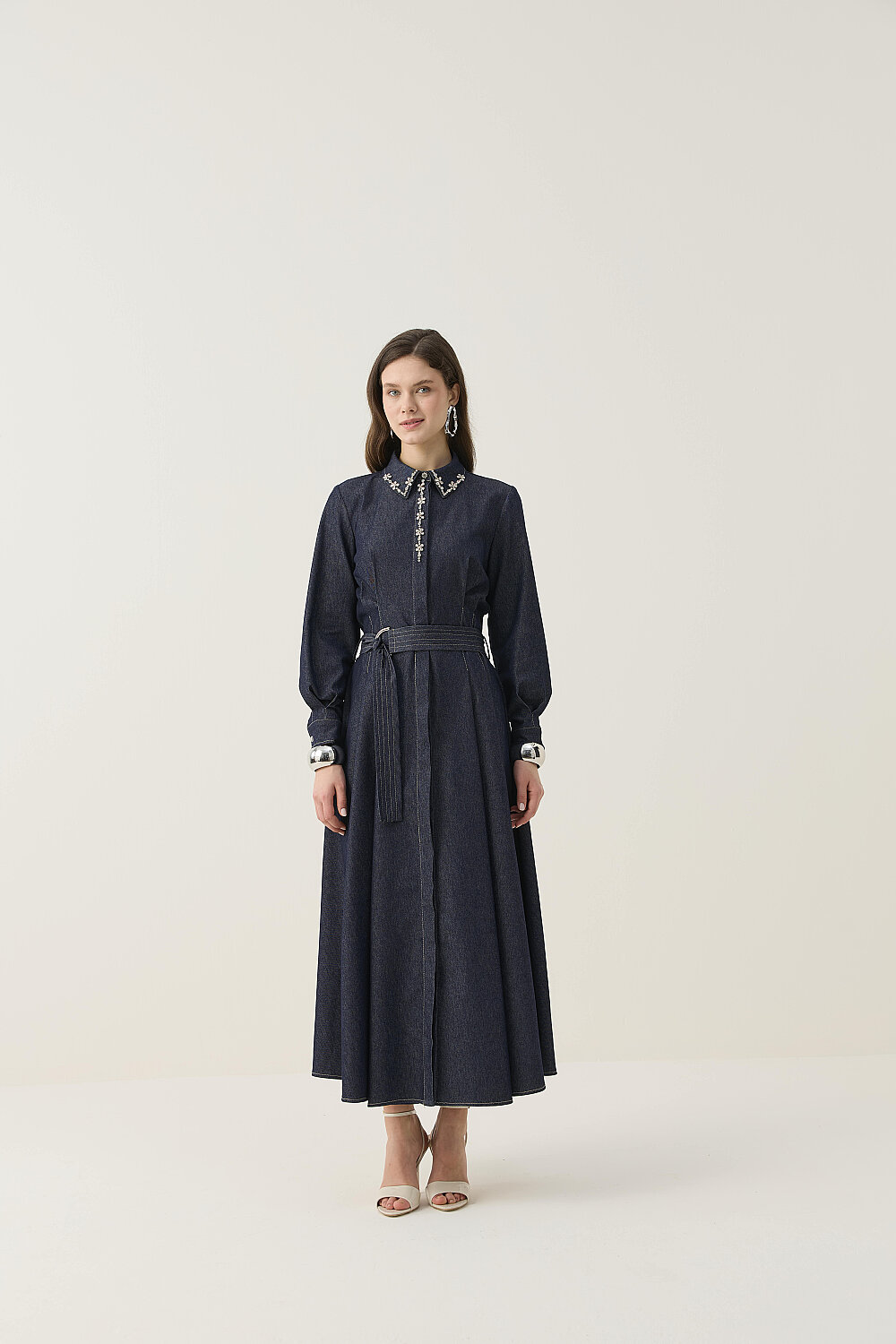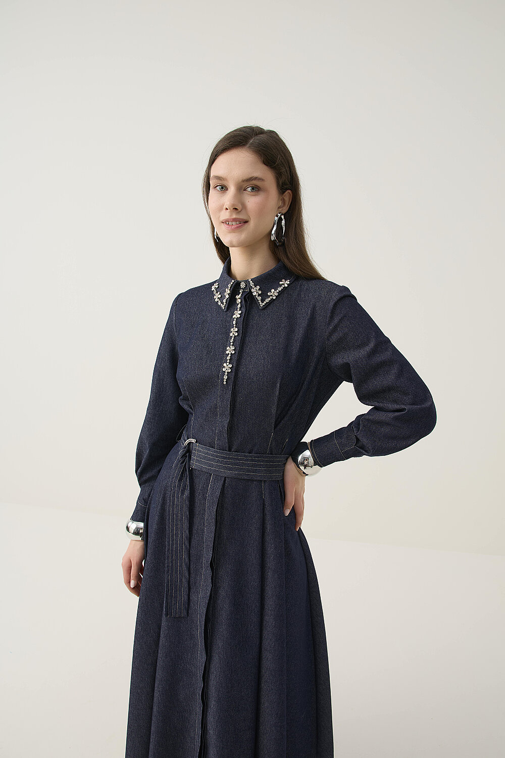 EL İŞLEMESİ DETAYLI TAŞLI DENİM ELBİSE